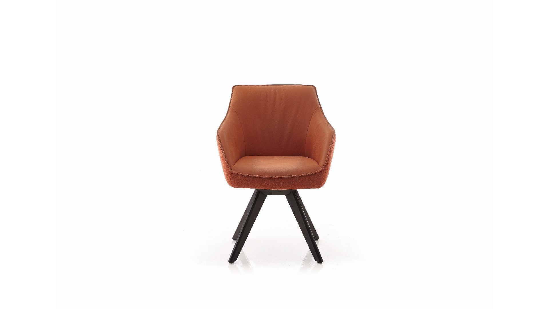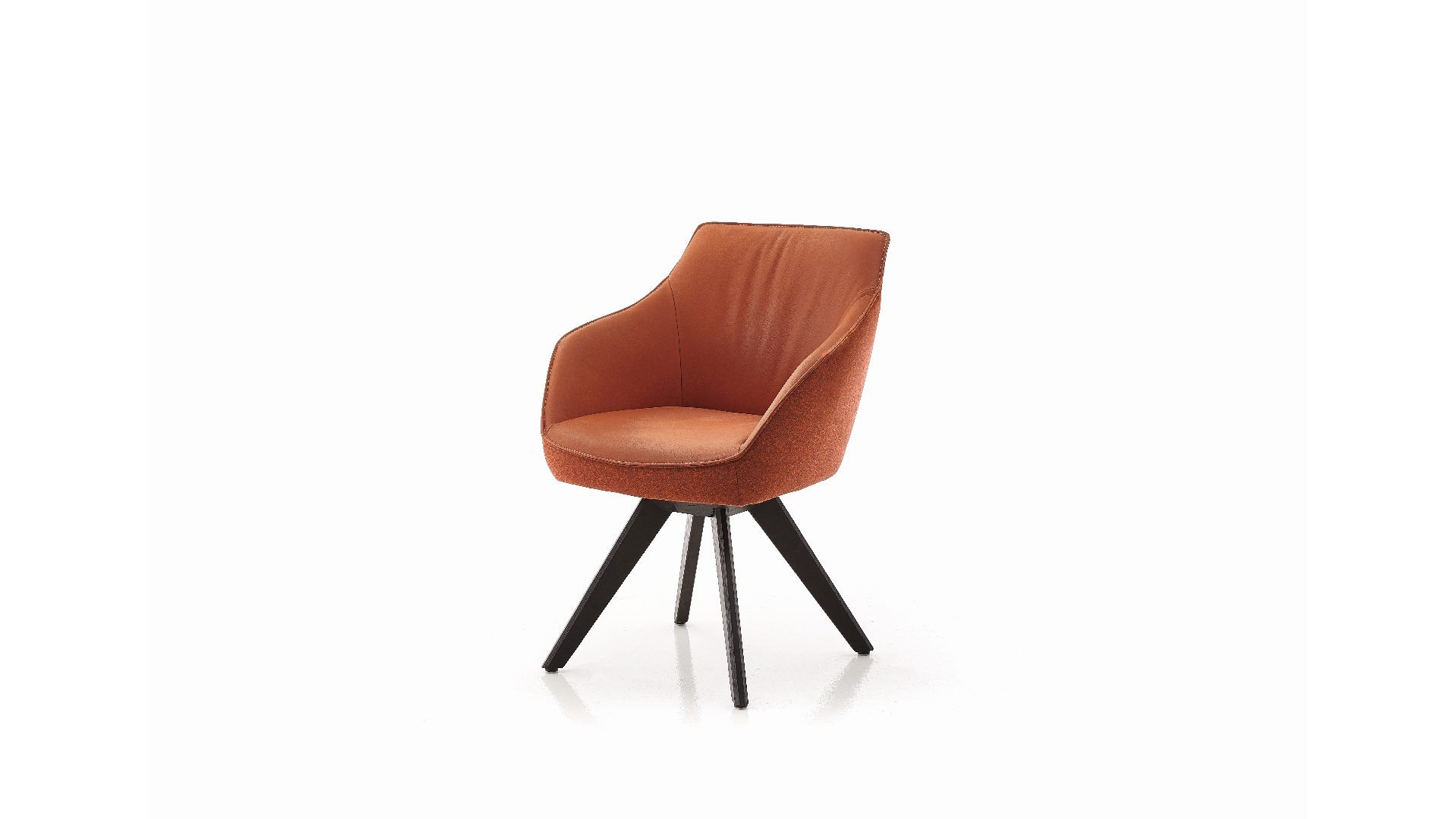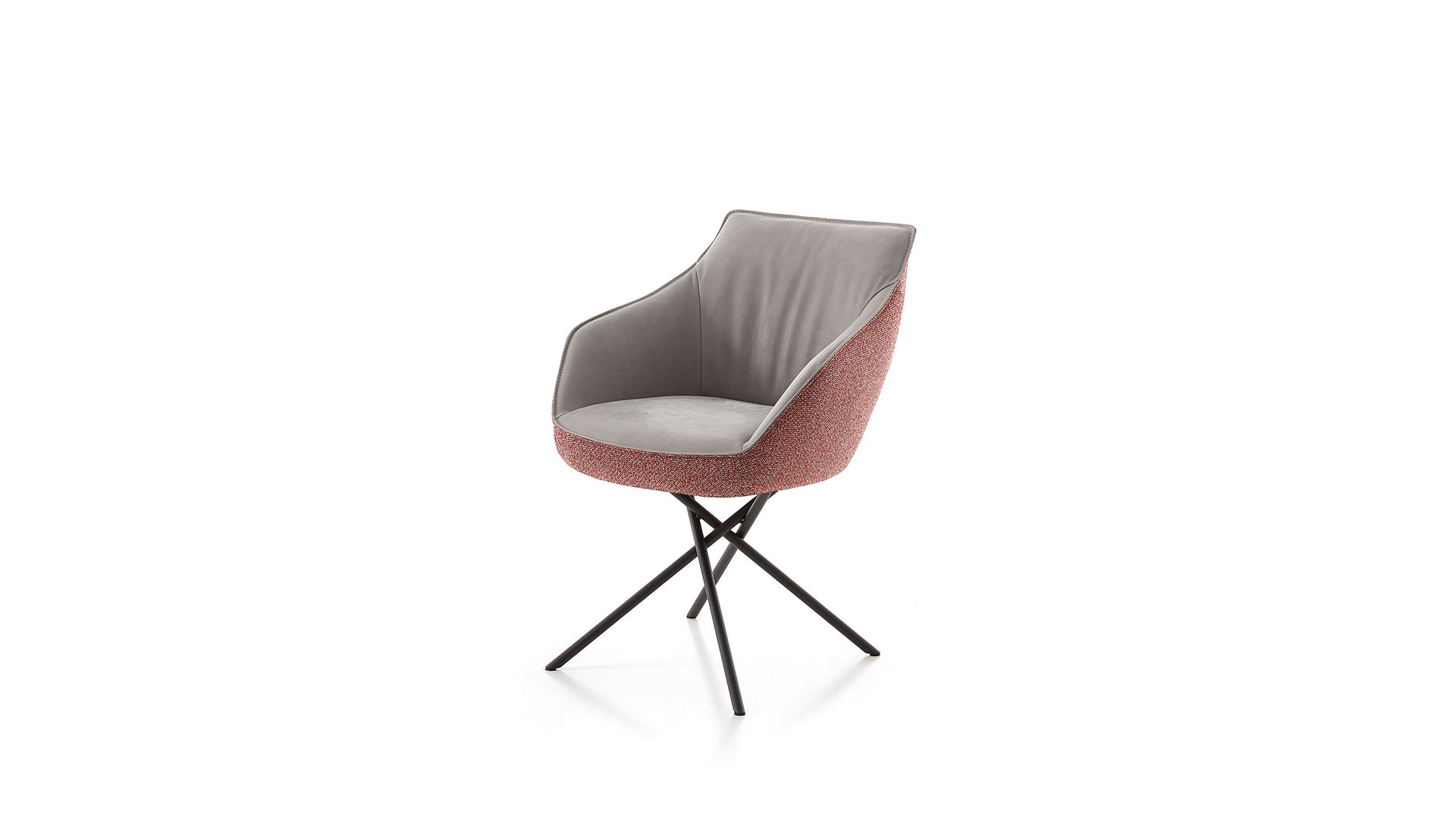 Potahový materiál látka, kůže nebo kombinace, čalounění neformální - volné. 2 typy podnoží v kovu, 5 typů v masivním dřevě - volitelně možnost otáčení s automatický vracením. Okrajový šev možný v kontrastním prošití nebo tónu sedadla.
