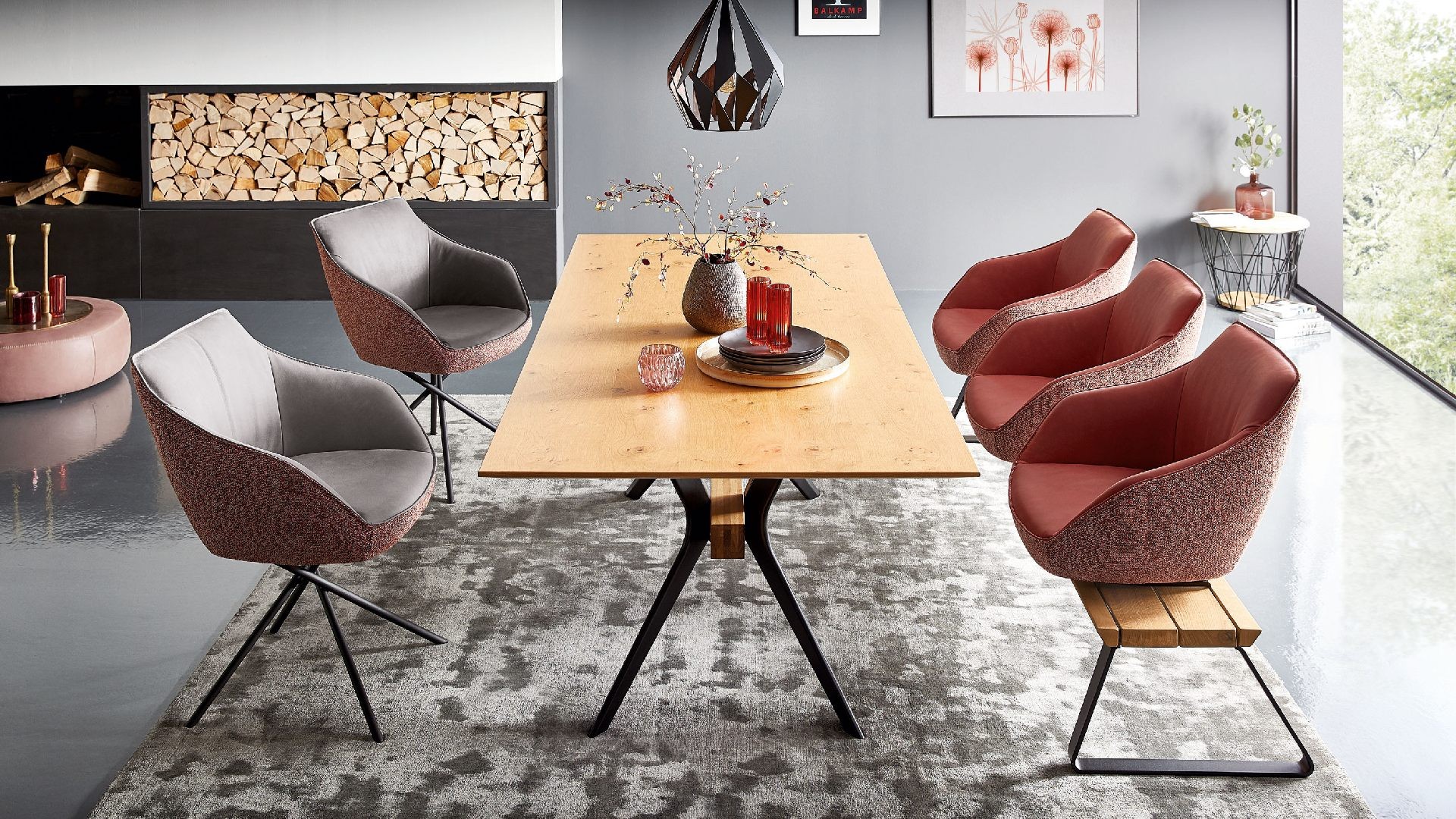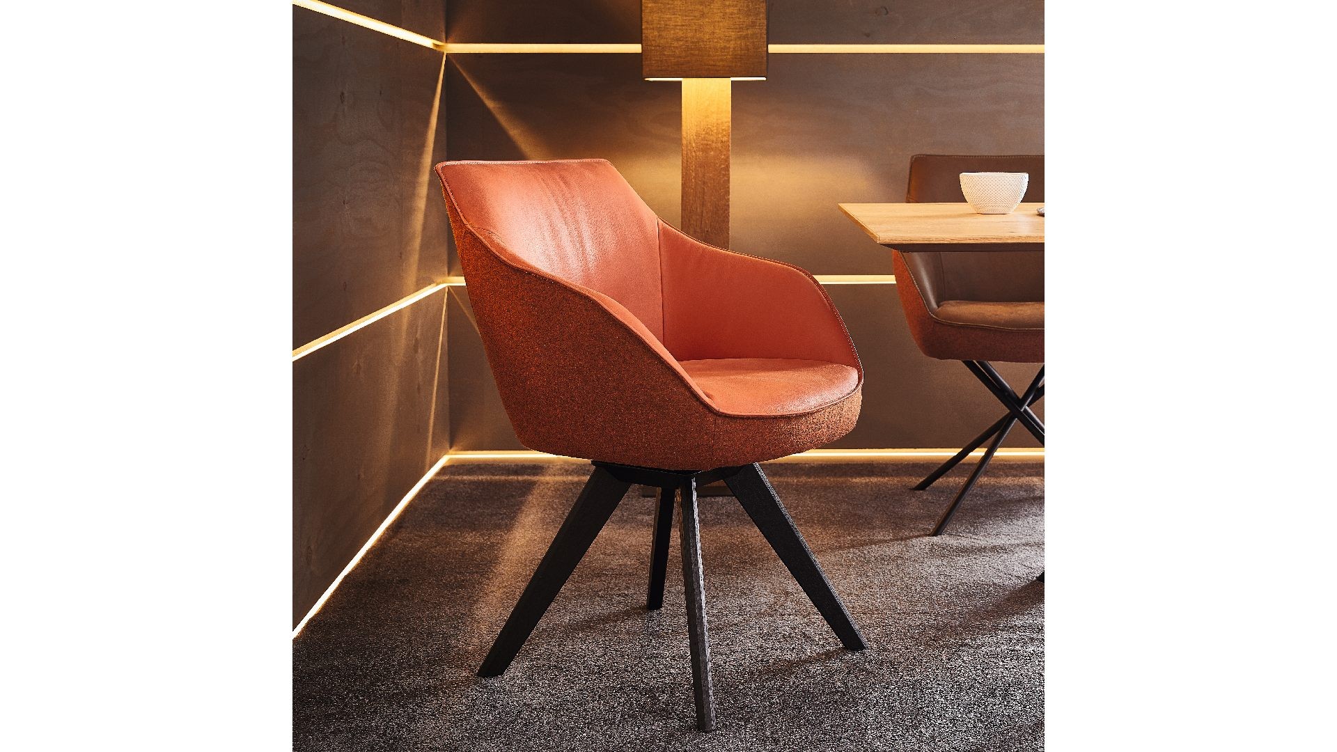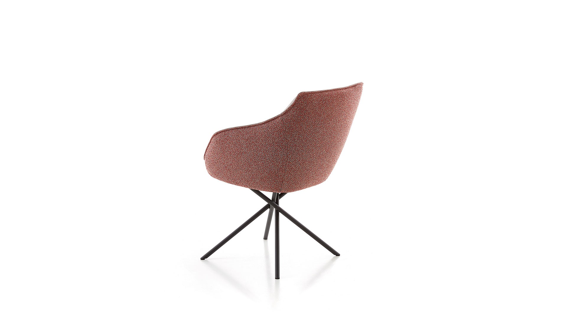 Potahový materiál látka, kůže nebo kombinace, čalounění neformální - volné. 2 typy podnoží v kovu, 5 typů v masivním dřevě - volitelně možnost otáčení s automatický vracením. Okrajový šev možný v kontrastním prošití nebo tónu sedadla.