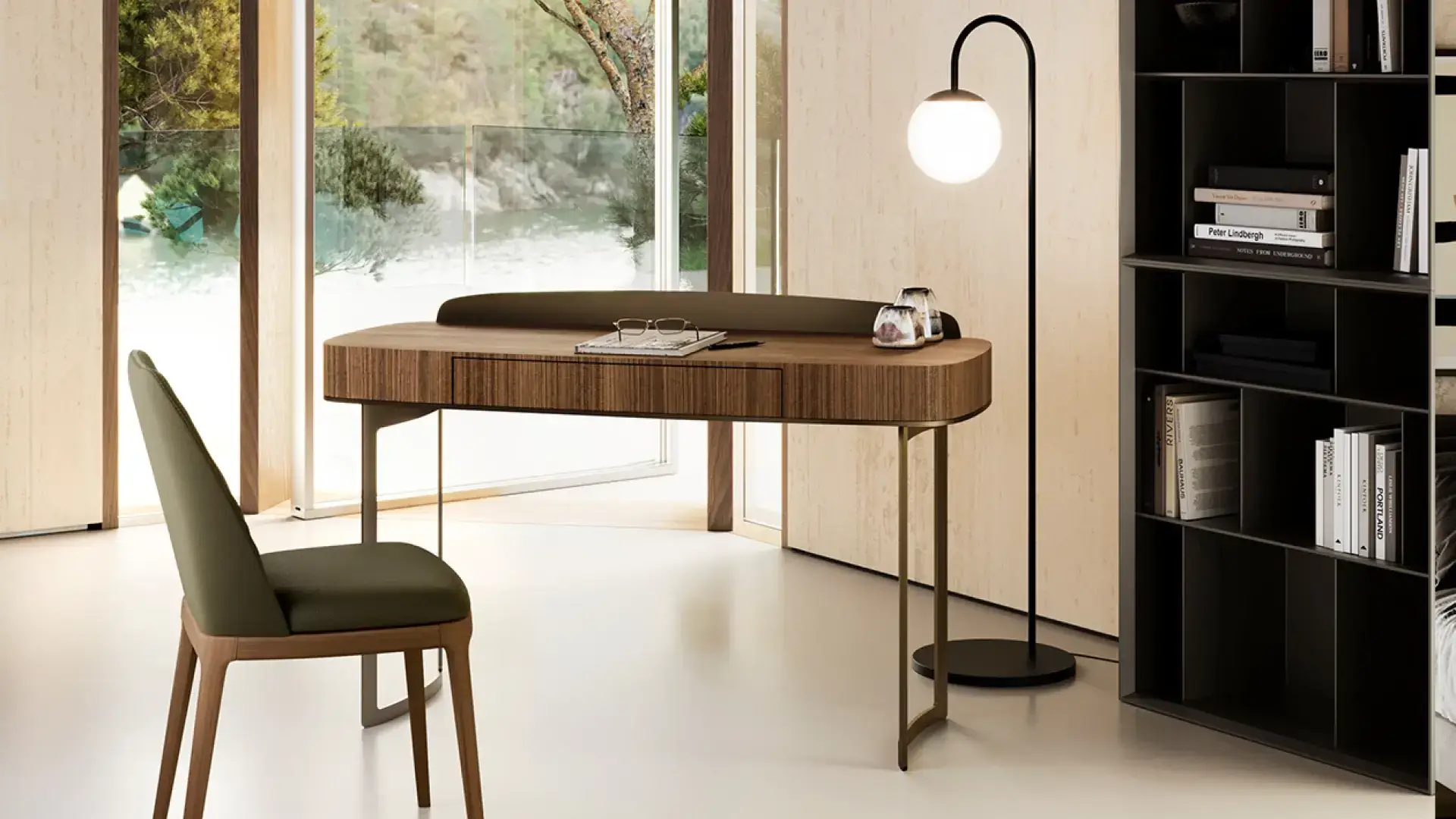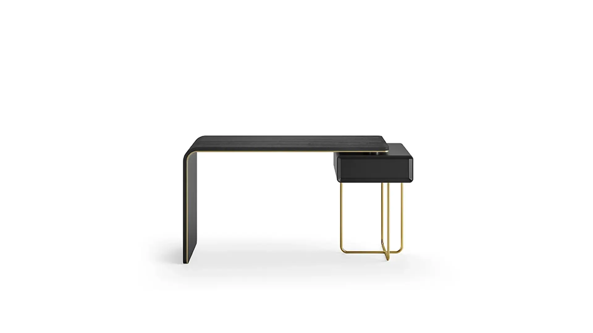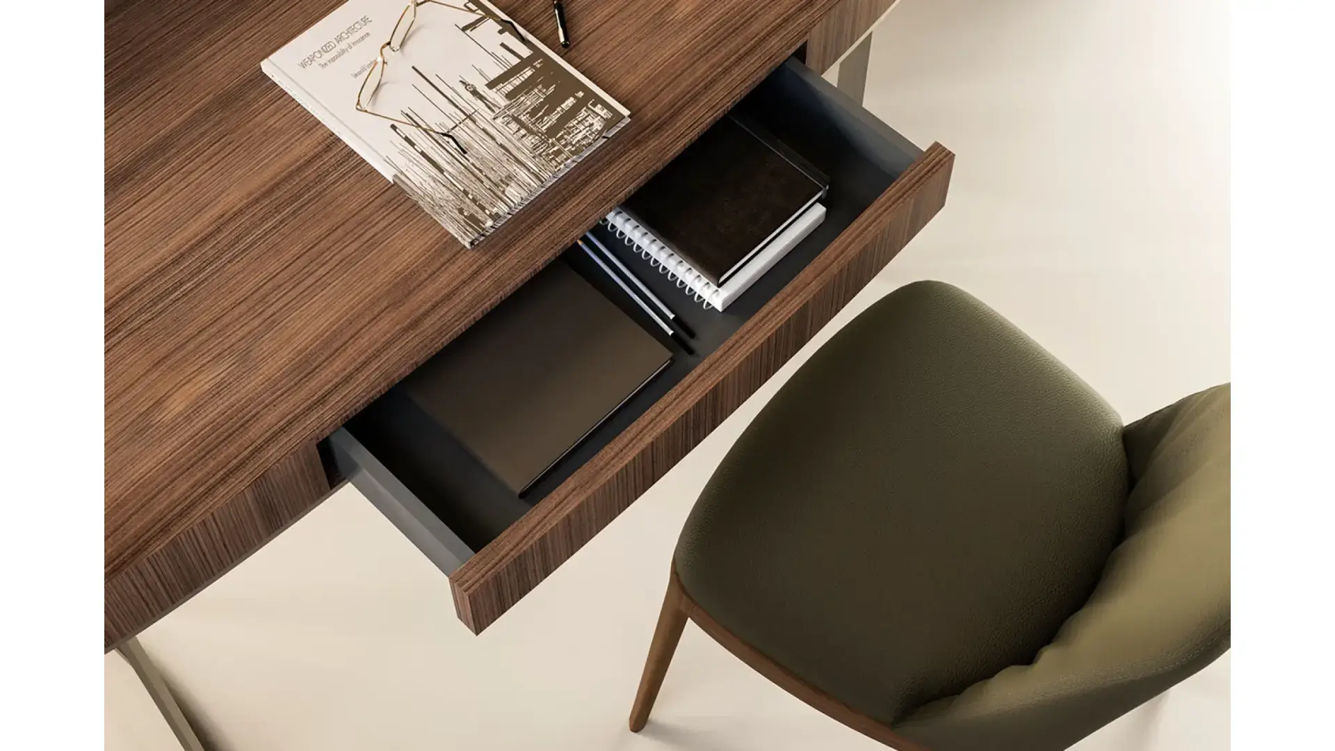 Psací stůl Lyra je elegantní kus nábytku s čistými, minimalistickými liniemi, ideální pro domácí pracovní koutek. Navržen designérem Nellem Palombou, stůl nabízí praktickou centrální zásuvku a stabilní konstrukci s podnoží a rámem z lakovaného kovu, zatímco horní deska je z dýhovaného dřeva s decentním lakovaným profilem.