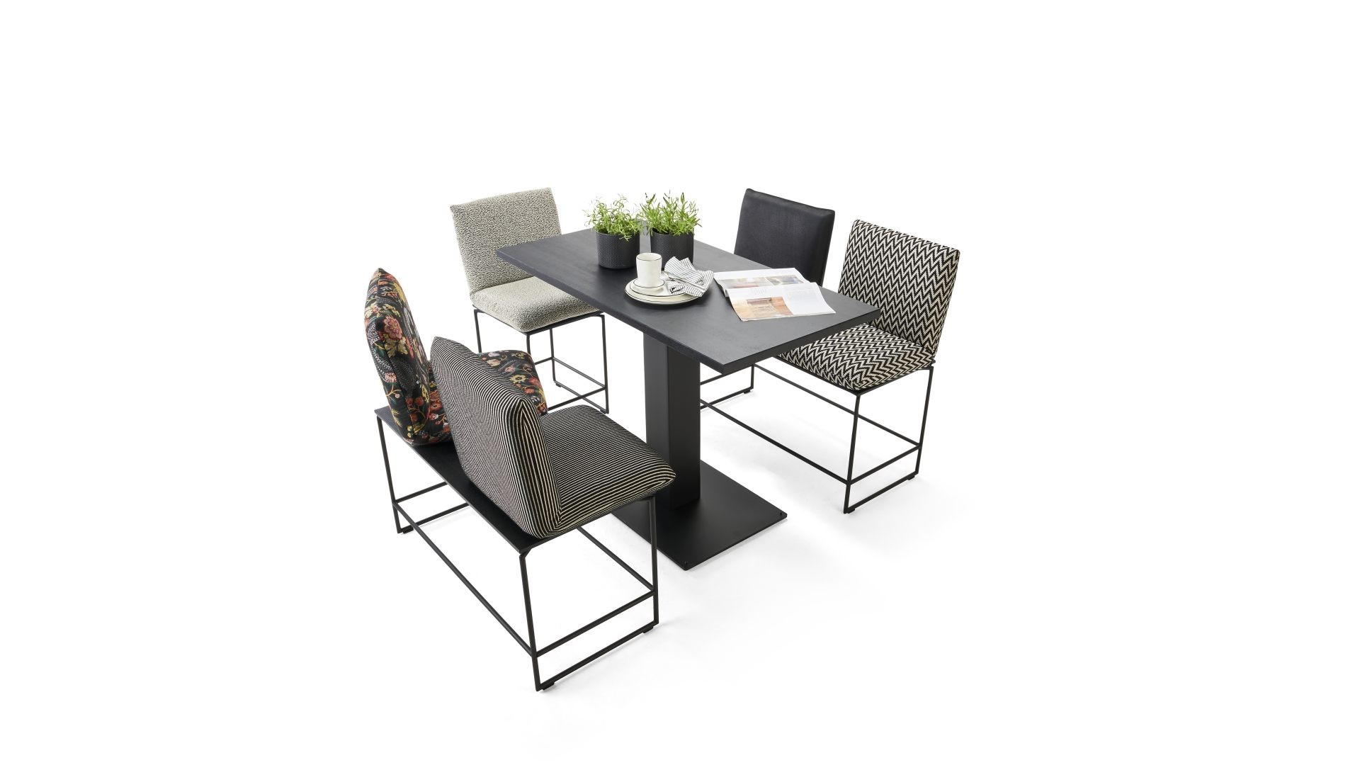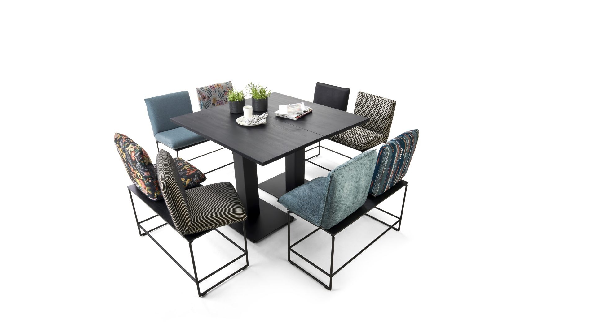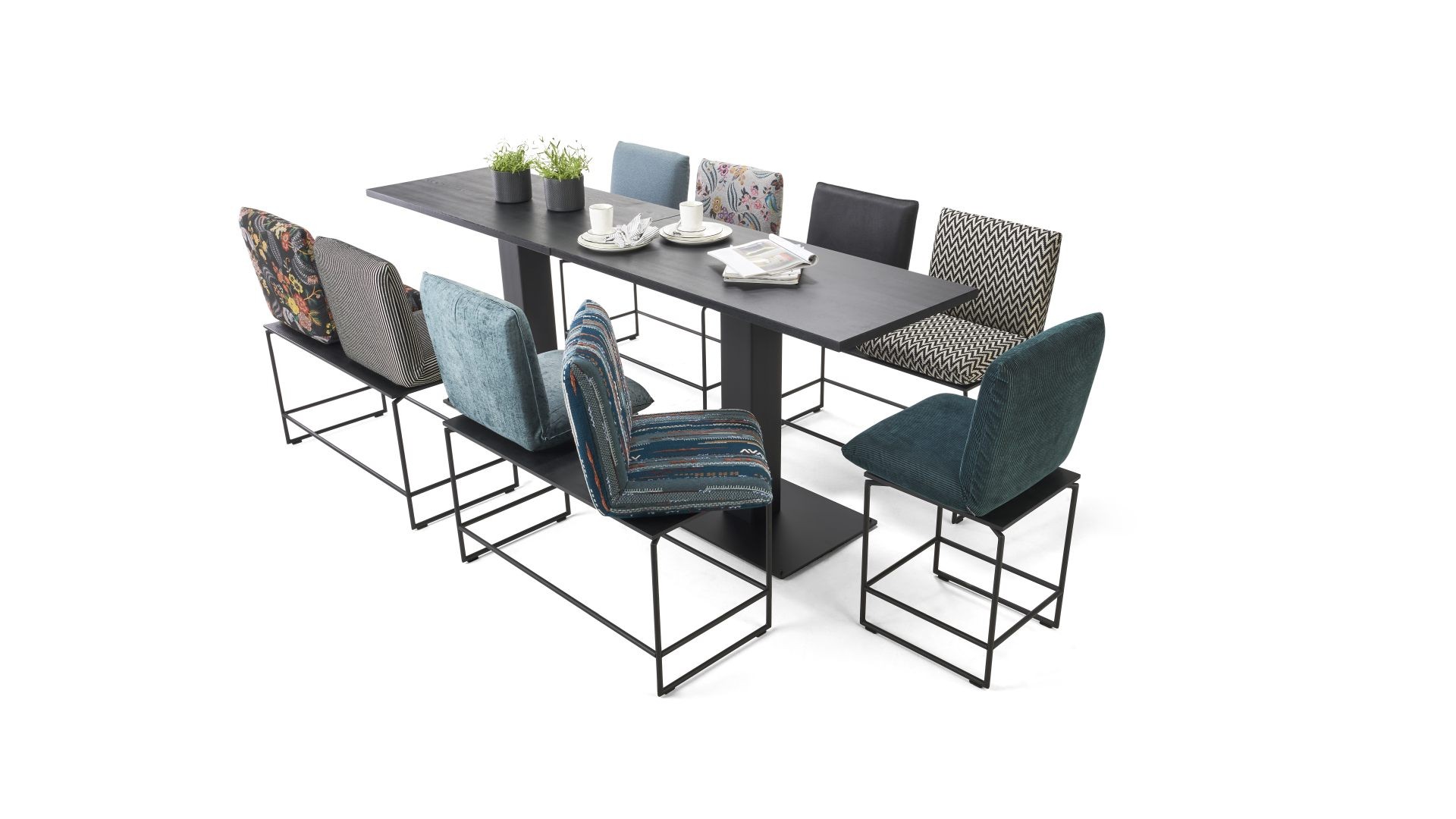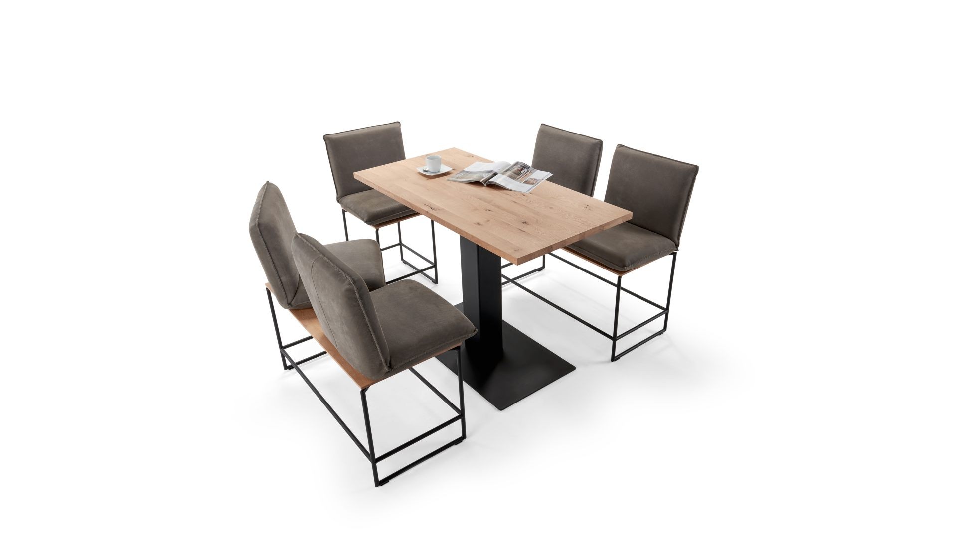 NEFORMÁLNÍ STRAVOVÁNÍ. LEŽÉRNÍ STŮL V INDUSTRIÁLNÍM DESIGNU DOPLŇUJÍ LAVICE S OTOČNÝMI SEDÁKY A POHODLNÝMI OPĚRADLY S FUNKCÍ POLOHOVÁNÍ. DESKA STOLU A LAVICE JE Z MASIVNÍHO PRÉMIOVÉHO DŘEVA, PODSTAVNÉ RÁMY Z OCELI V ČERNÉM MATNÉM LAKU. MOŽNOST VÝBĚRU DRUHU DŘEVA, ČALOUNĚNÍ (LÁTKA/KŮŽE) A TYPU ŠVŮ. K DISPOZICI TAKÉ VE VENKOVNÍM PROVEDENÍ. UNIKÁTNÍ KUSOVÁ VÝROBA