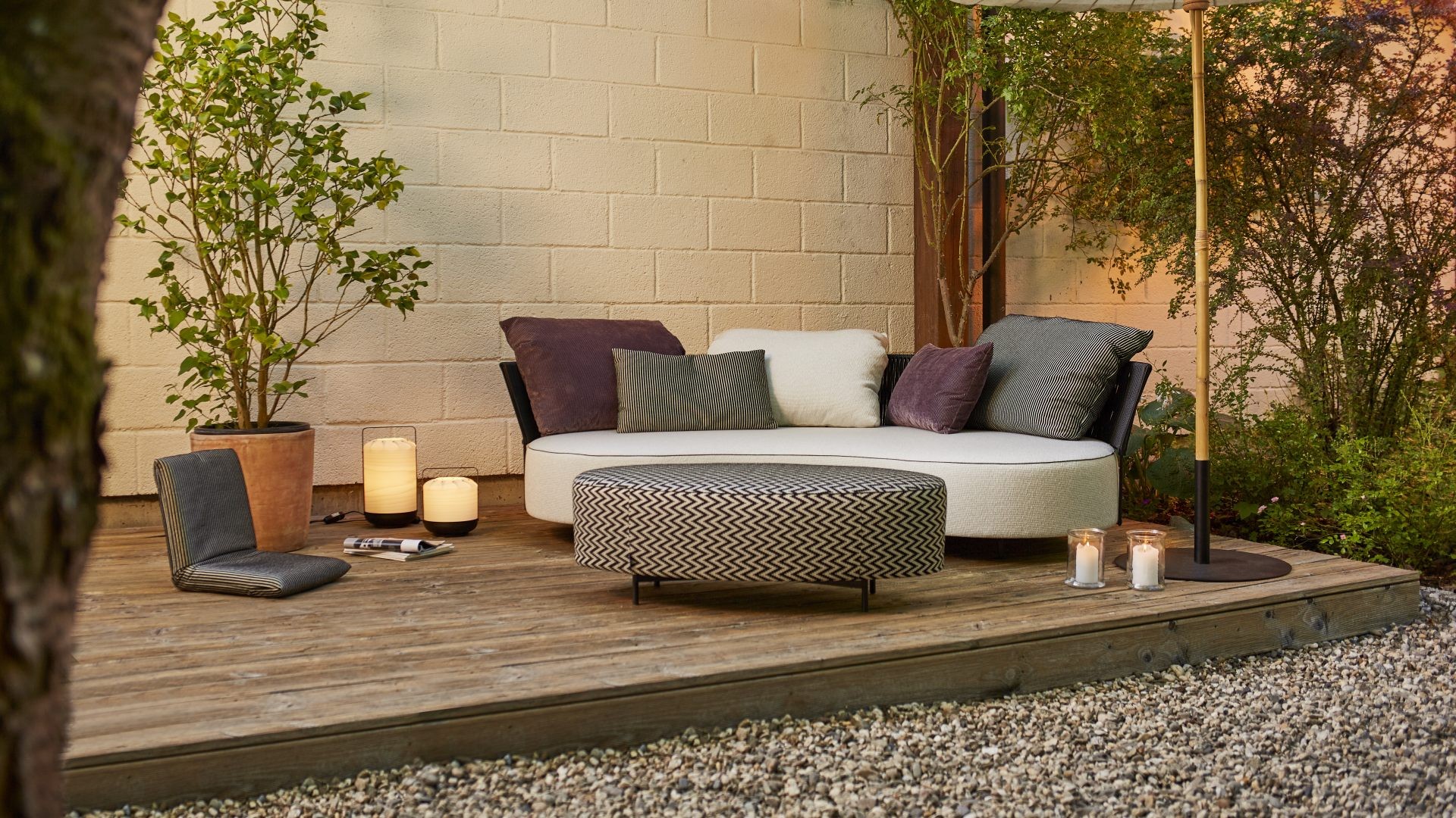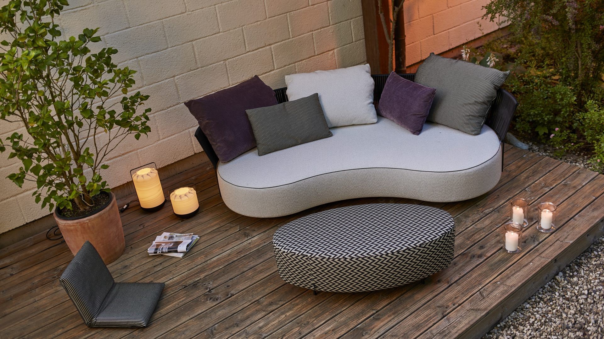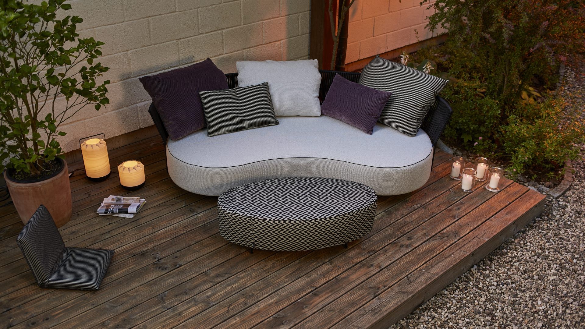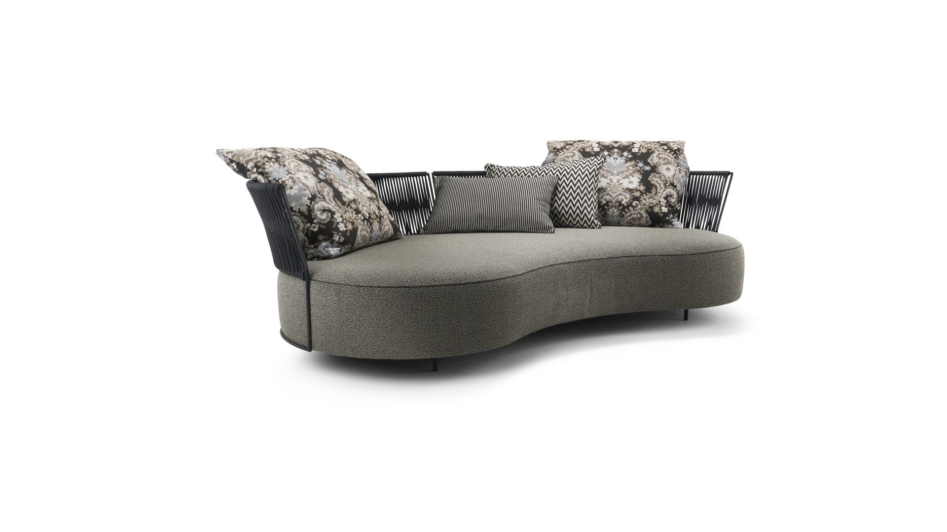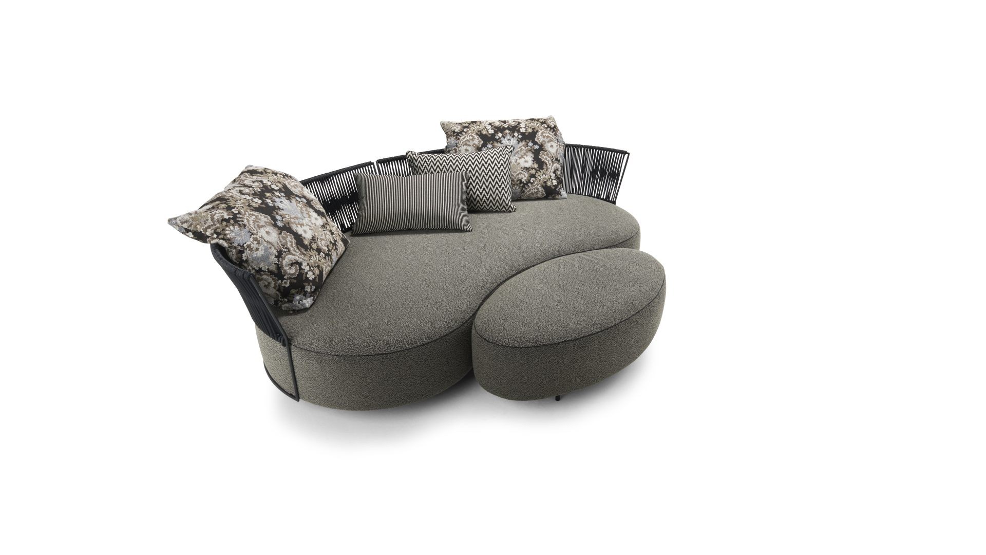 DOTKNOUT SE VÁNKU... LUXUS NEOBVYKLÝCH VĚCÍ. VELKÁ POHOVKA SE ZAOBLENOU LINIÍ A ESTETIKOU NĚČEHO VÝJIMEČNÉHO. VENKOVNÍ LENOŠENÍ S LETNÍM POCITEM. FILIGRÁNSKÉ OPĚRADLO S VÝPLETEM VE DVOU RŮZNÝCH PROVEDENÍCH DĚLÁ Z TÉTO POHOVKY VENKOVNÍ OSTROV POHODY. OVÁLNÝ TABURET, STEJNĚ JAKO RŮZNÉ POLŠTÁŘE ZAJIŠŤUJÍ INDIVIDUÁLNÍ POHODLÍ. UNIKÁTNÍ KUSOVÁ VÝROBA.