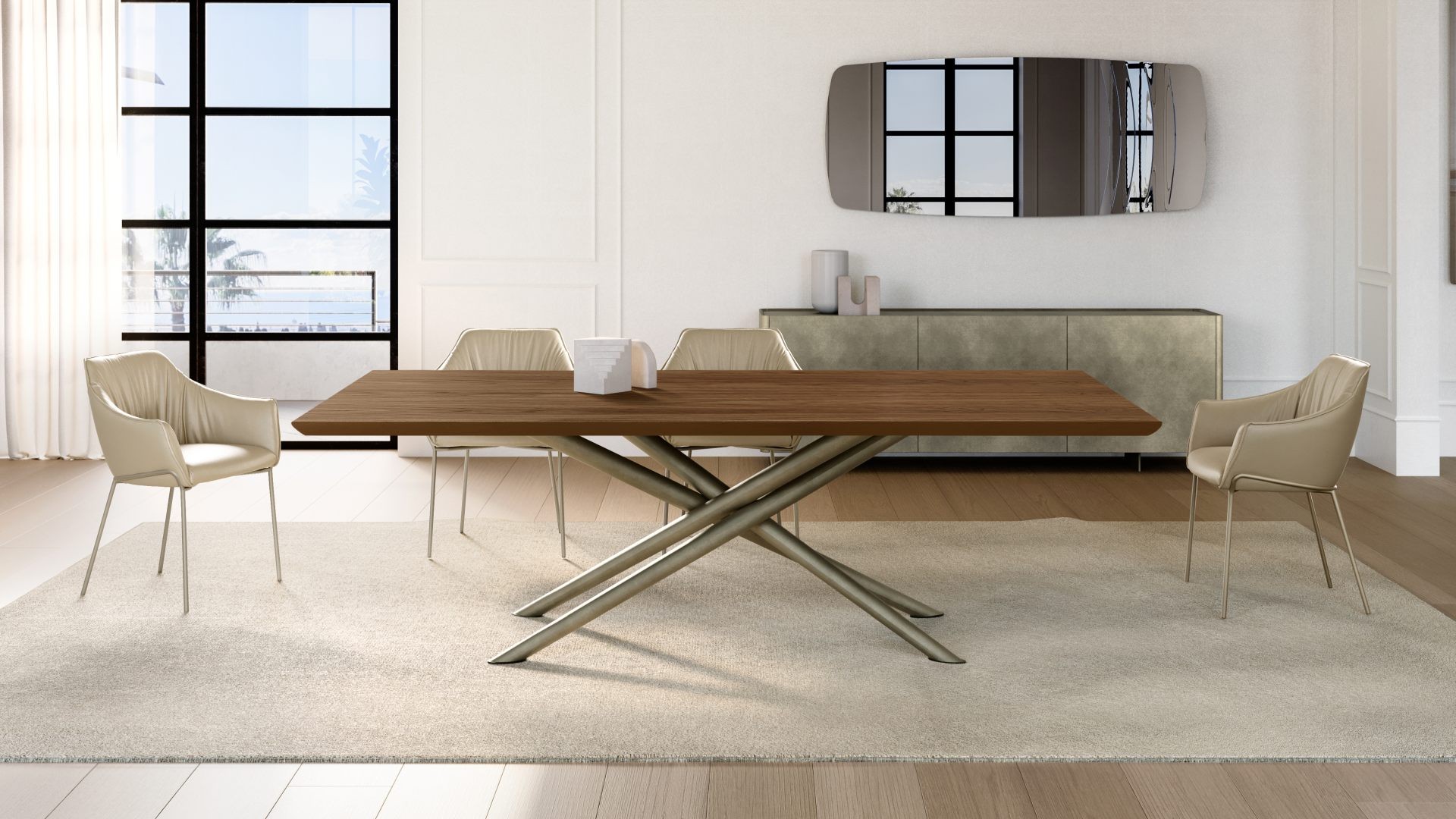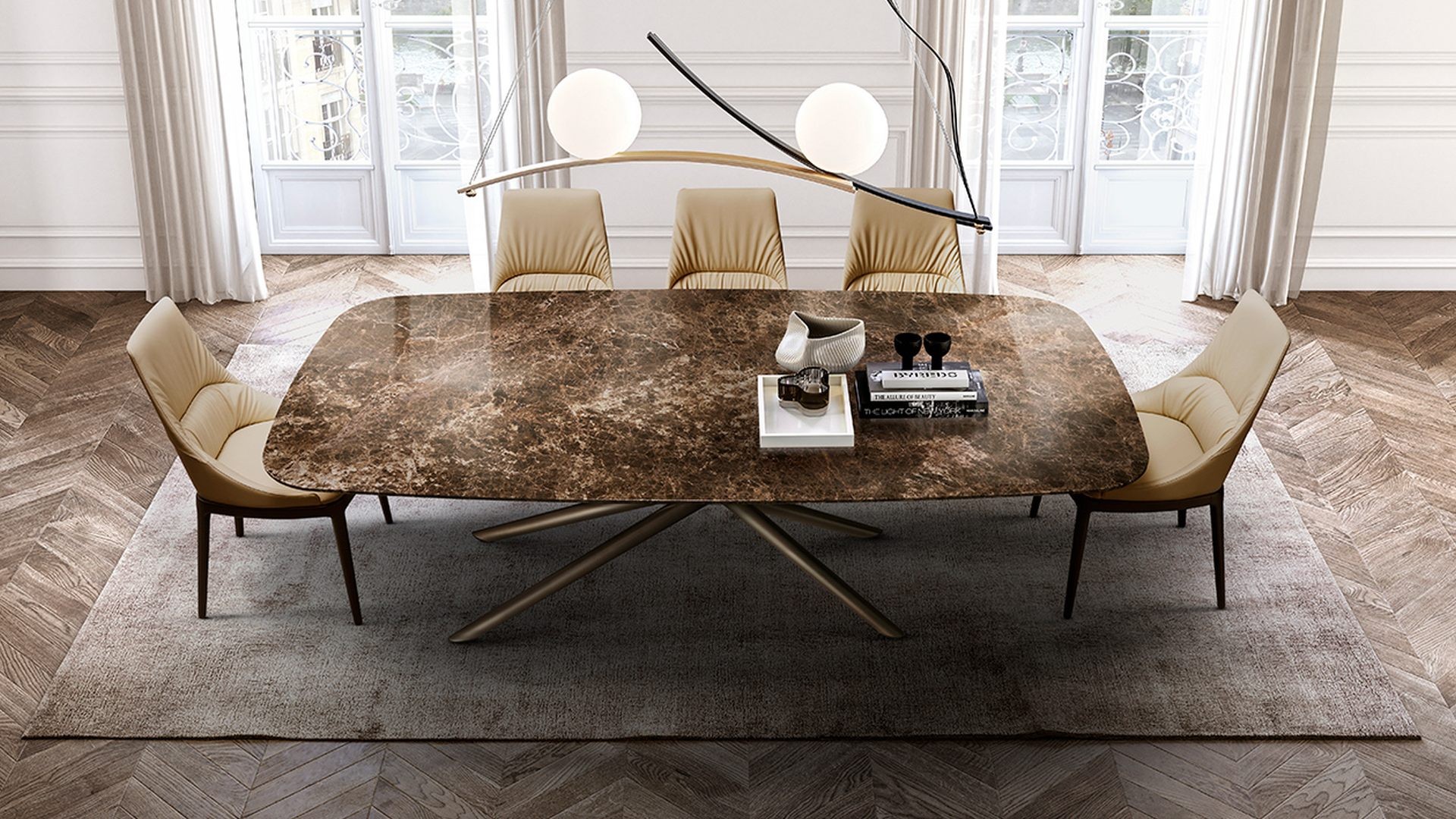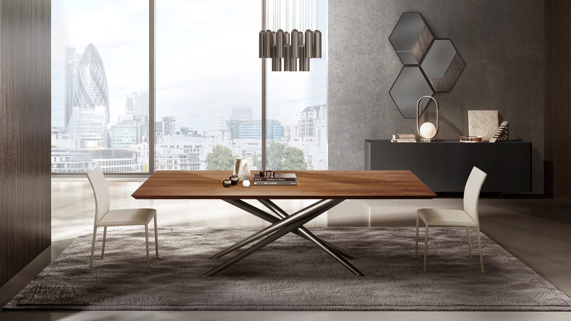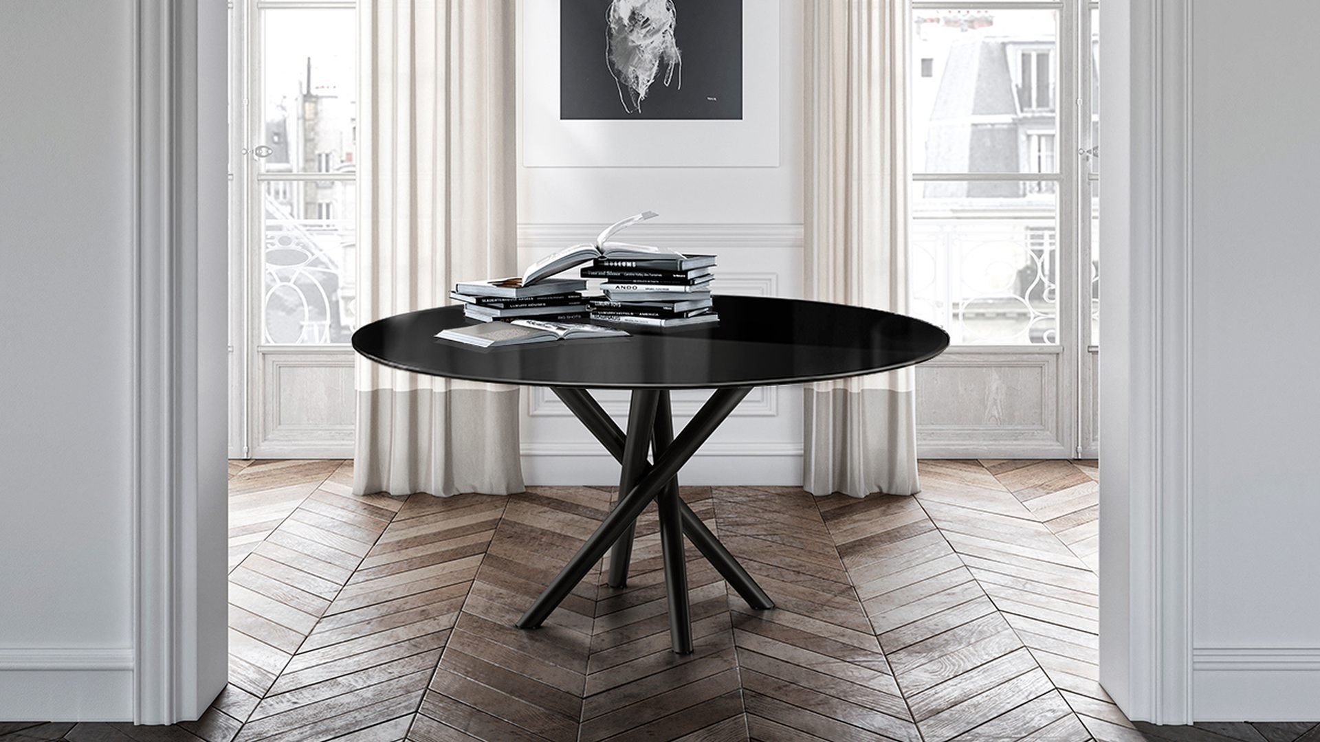 Tento designový jídelní stůl, který vytvořil designér Ollen Pal, má propracovanou lakovanou kovovou podnož, která díky originálnímu tvaru okamžitě upoutá pozornost. Kulatá, obdélníková nebo tvarovaná stolová deska z tvrzeného skla, keramiky, dřeva nebo mramoru je k dispozici v různých velikostech.