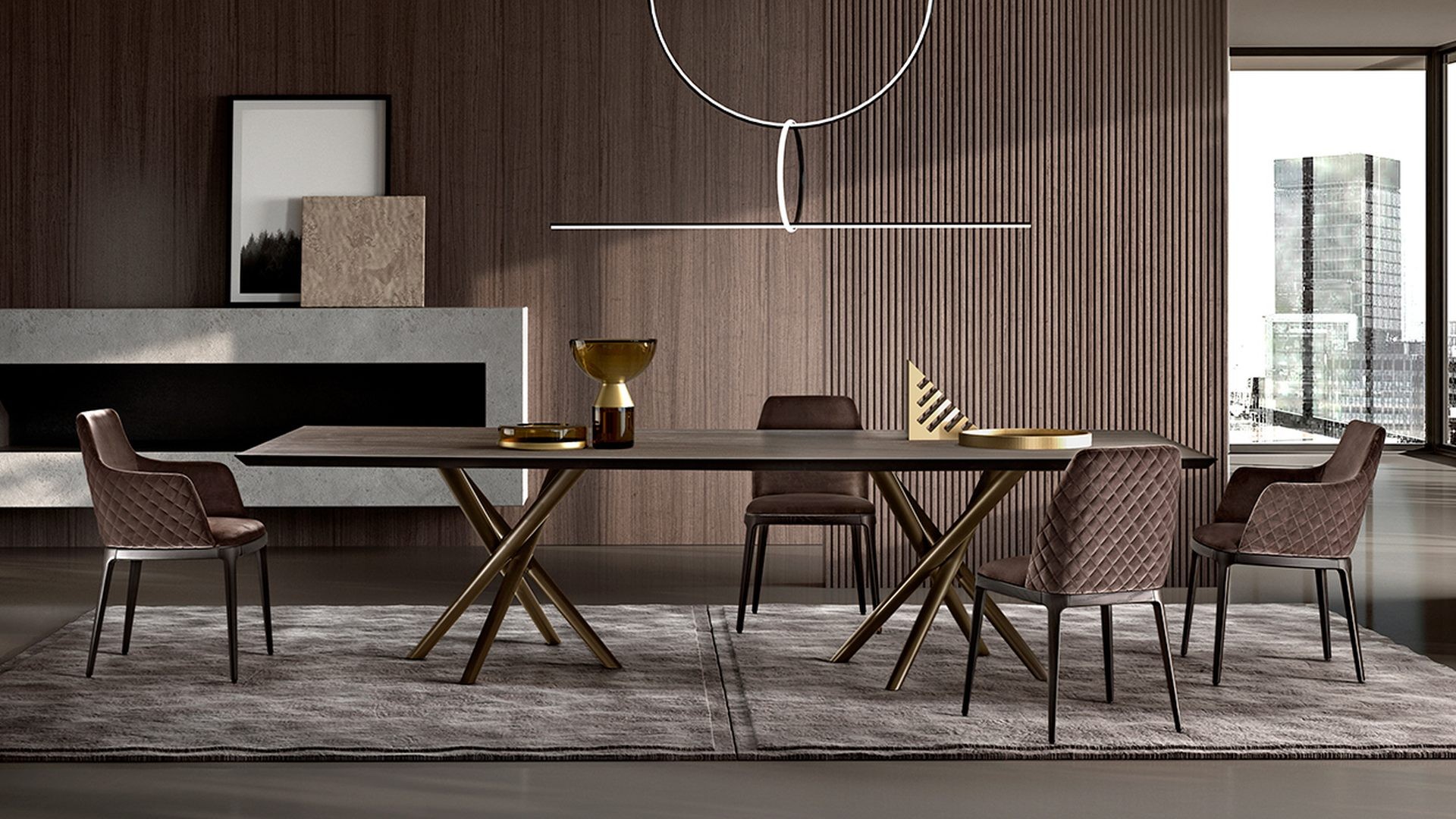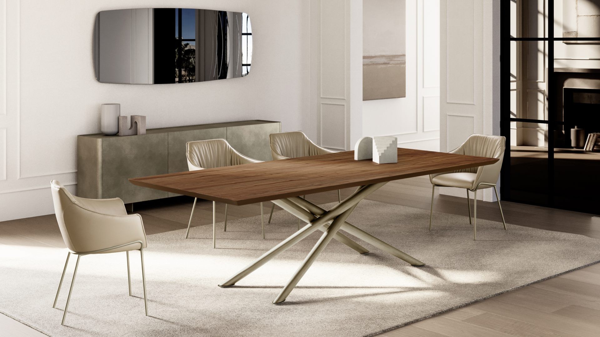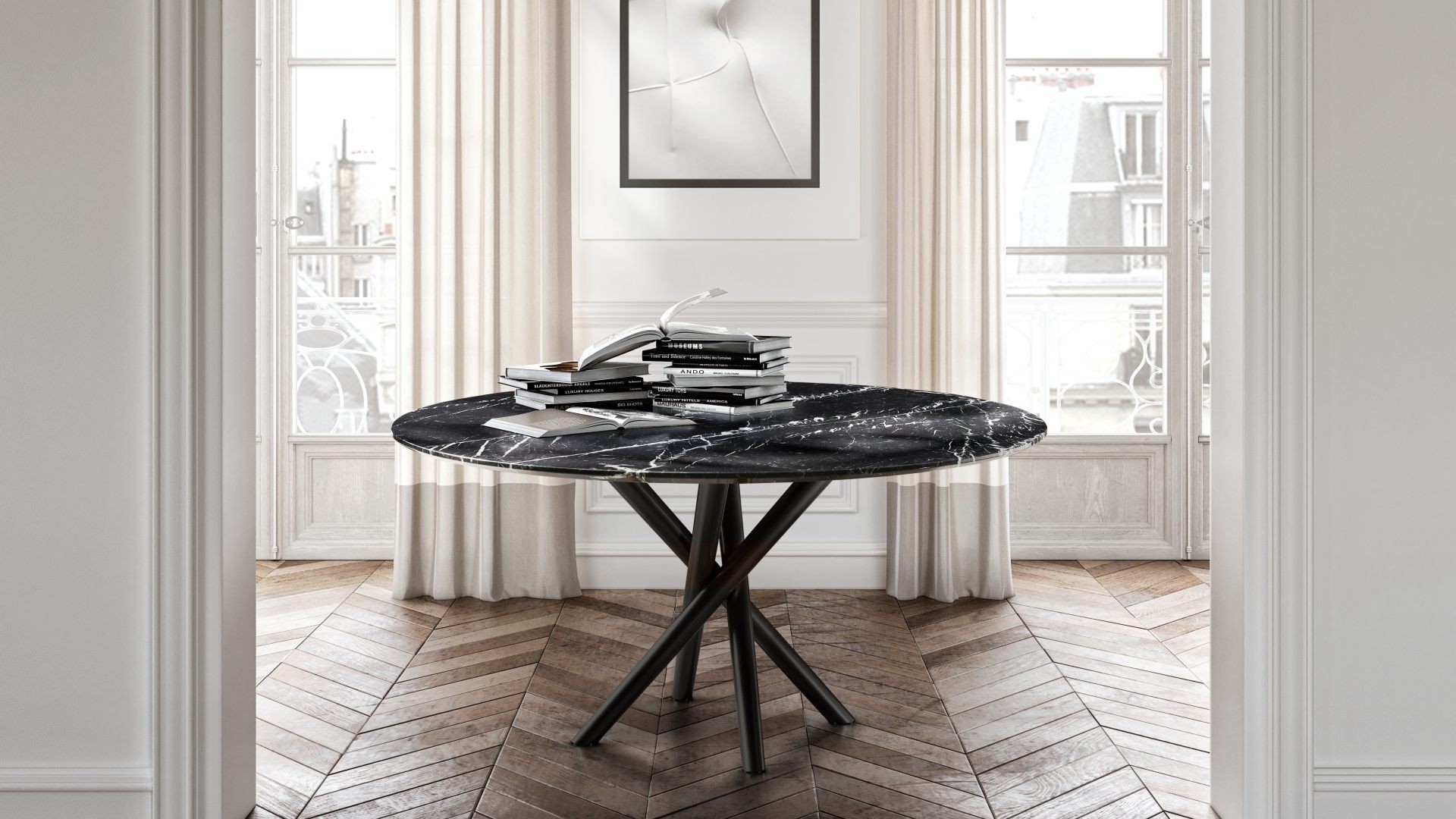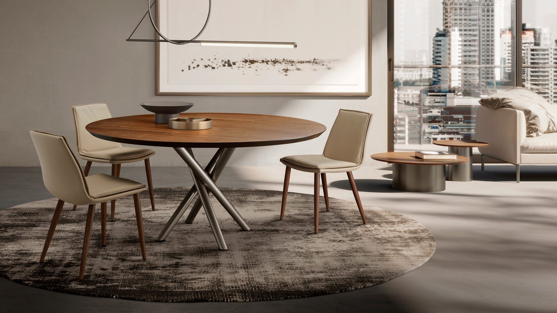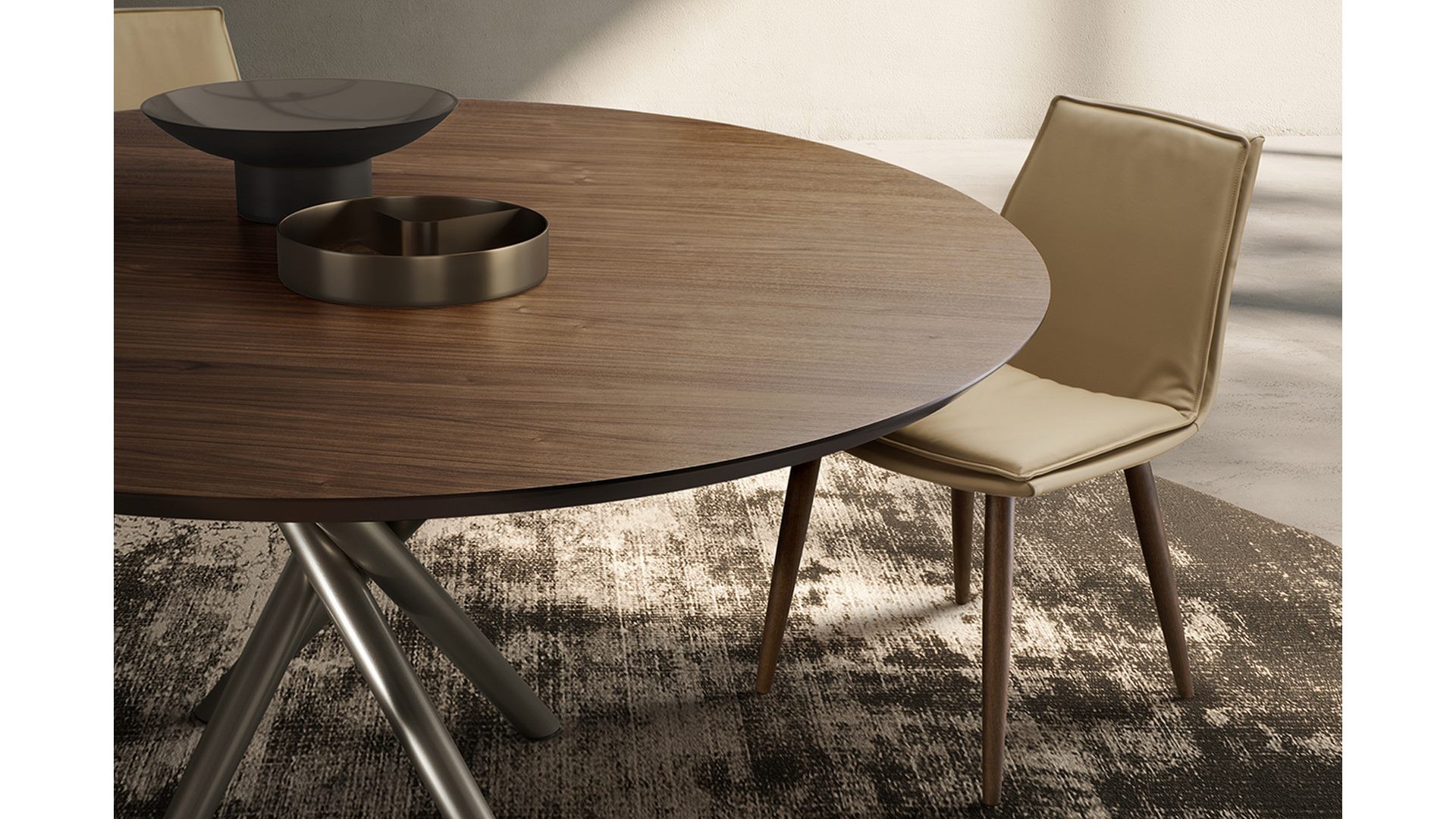Tento designový jídelní stůl, který vytvořil designér Ollen Pal, má propracovanou lakovanou kovovou podnož, která díky originálnímu tvaru okamžitě upoutá pozornost. Kulatá, obdélníková nebo tvarovaná stolová deska z tvrzeného skla, keramiky, dřeva nebo mramoru je k dispozici v různých velikostech.