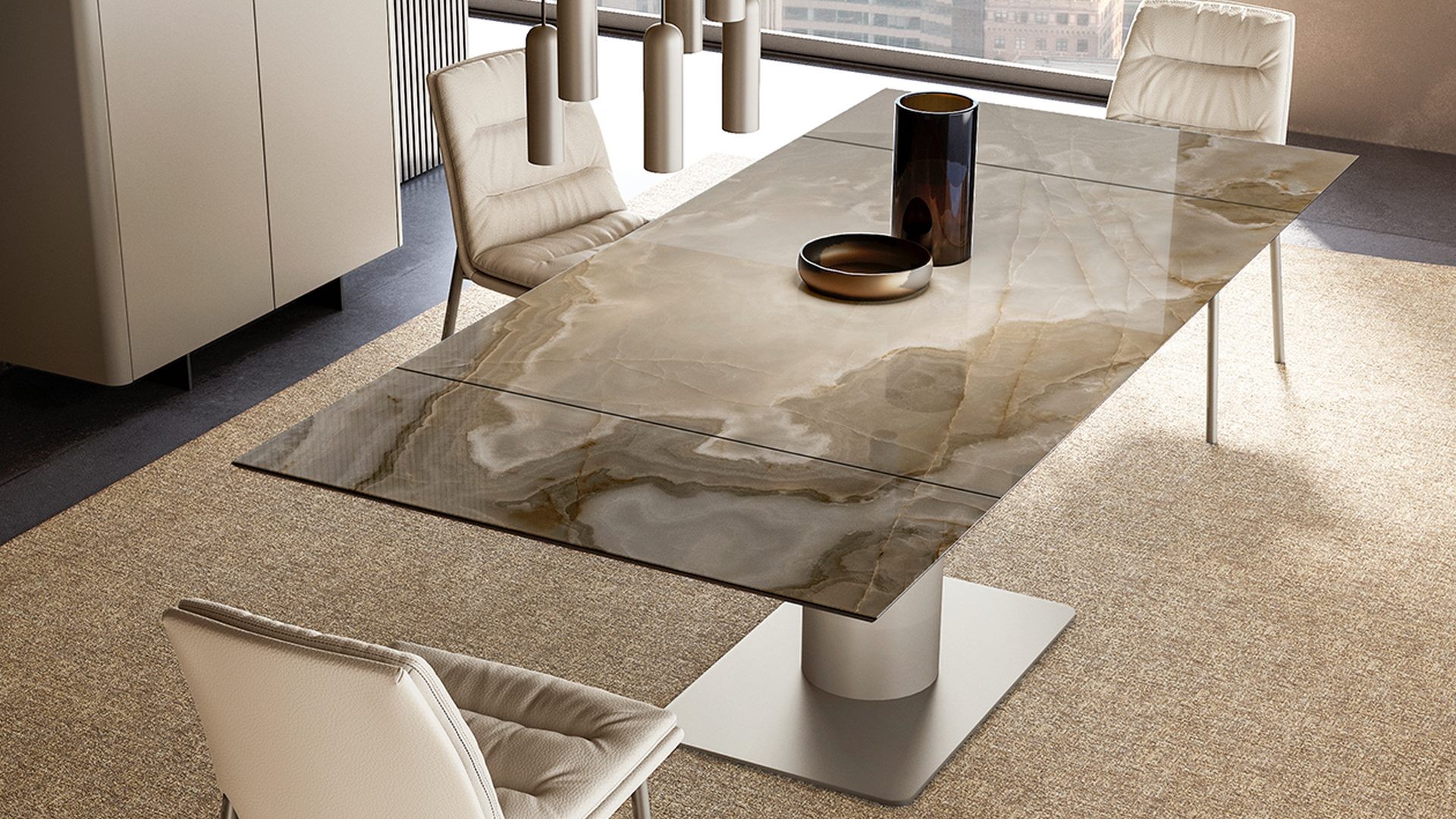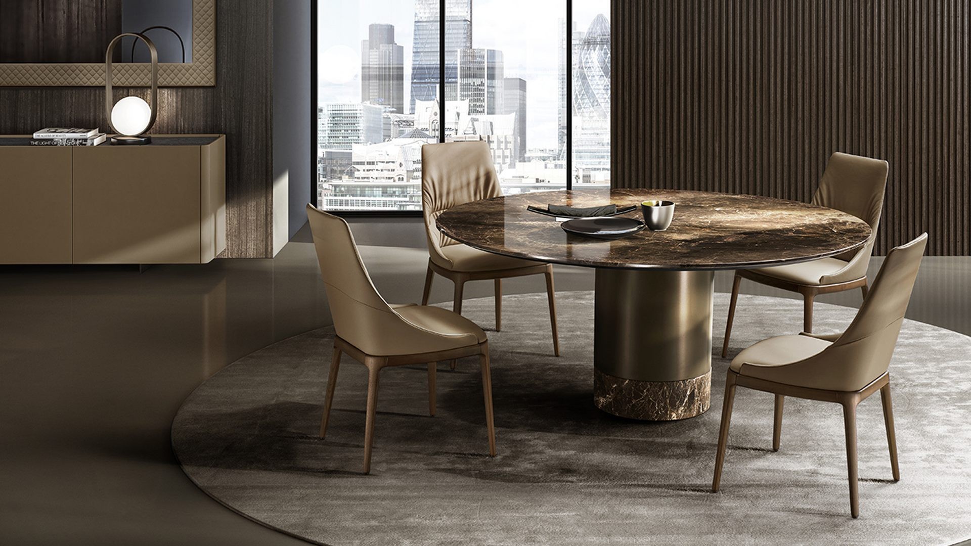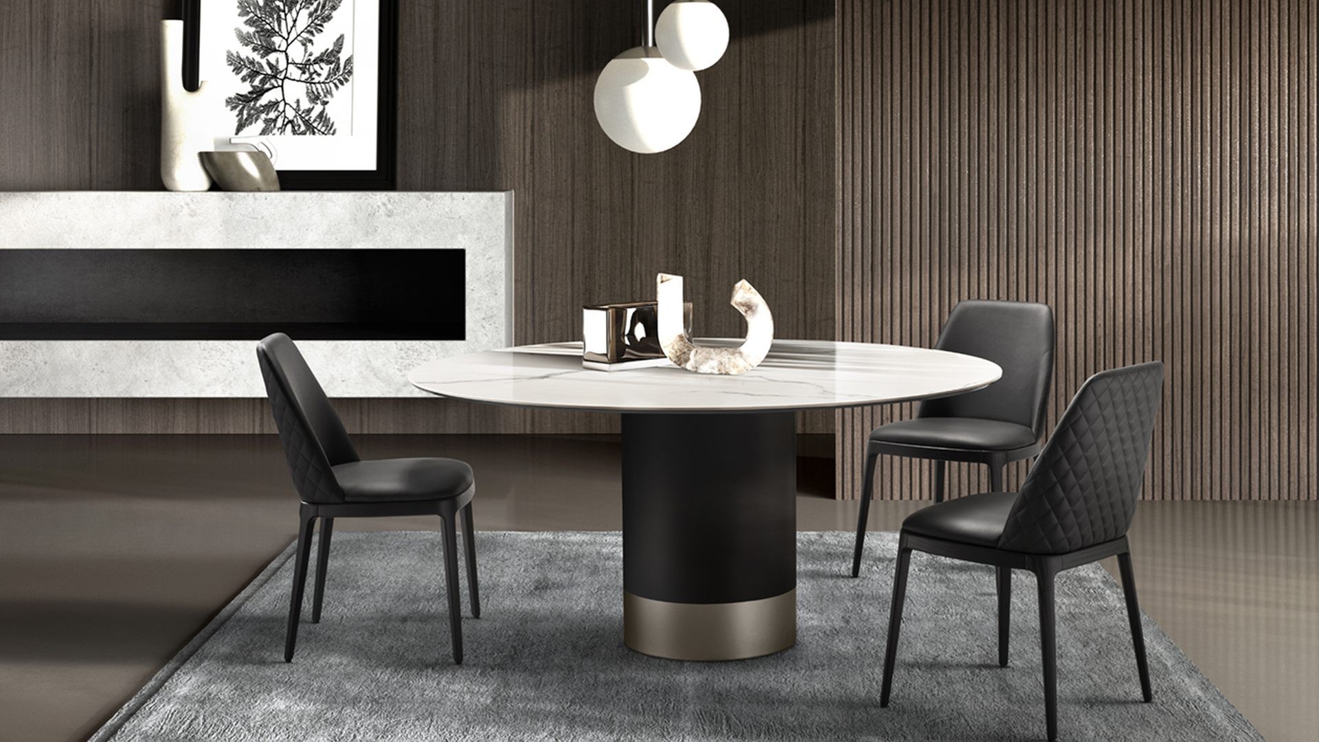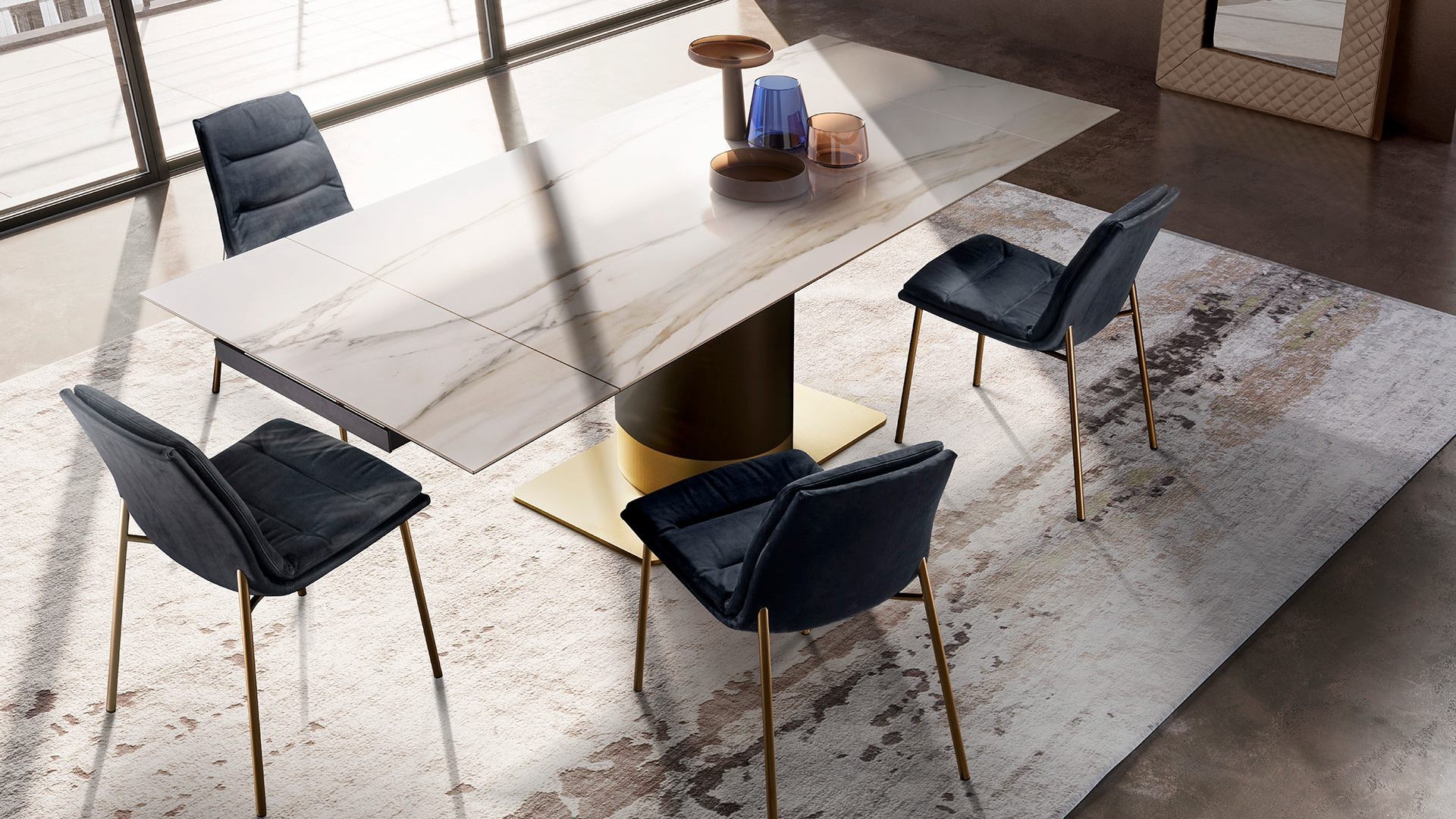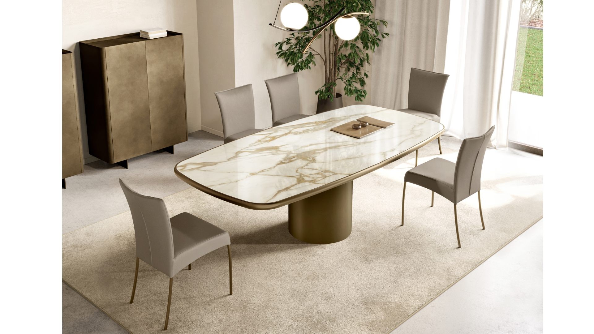 Díky svému designu se tento stůl bez problémů hodí do moderních prostor. Podnož je z kovu lakovaného jednou nebo dvěma barvami, zatímco stolová deska může být kulatá, obdélníková nebo tvarovaná v provedení keramika, mramor, sklo nebo dřevo.