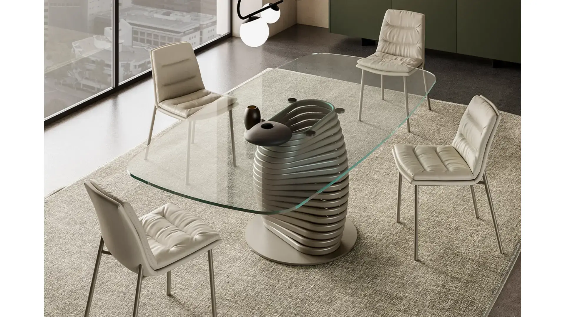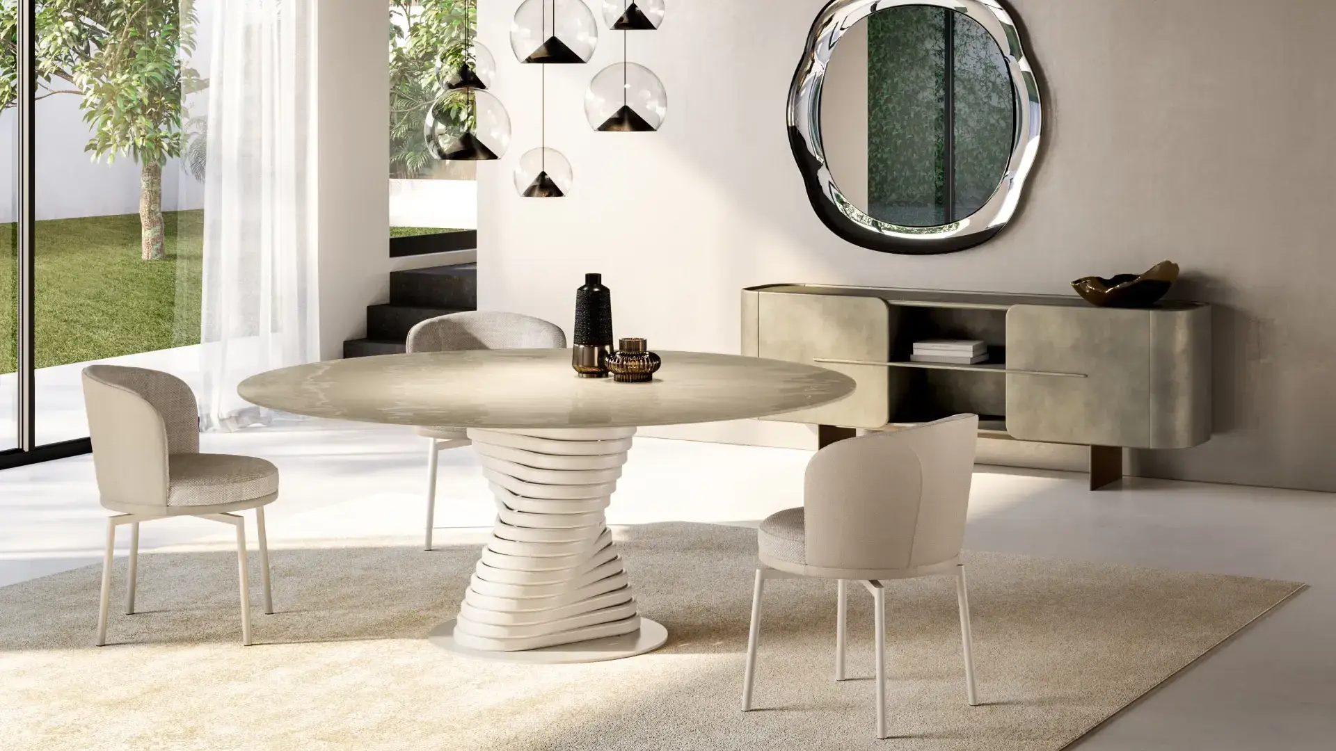 Jeho podnoží navržené společností Archirivolto, je inspirováno futuristickými tvary, upoutává pozornost a dodává prostředí nádech rafinované originality. Kroucený tvar kovové základny vytváří dynamický pohyb, jako když materiálový vír stoupá vzhůru. Tento estetický prvek není jen stylistickým výstřelkem, ale zajišťuje také bezvadnou robustnost a stabilitu stolu. Podnož je lakovaná v několika barevných variantách. Stolová deska může být kulatá, obdélníková nebo se zaoblenými hranami v provedení keramika, mramor, sklo nebo dřevo.