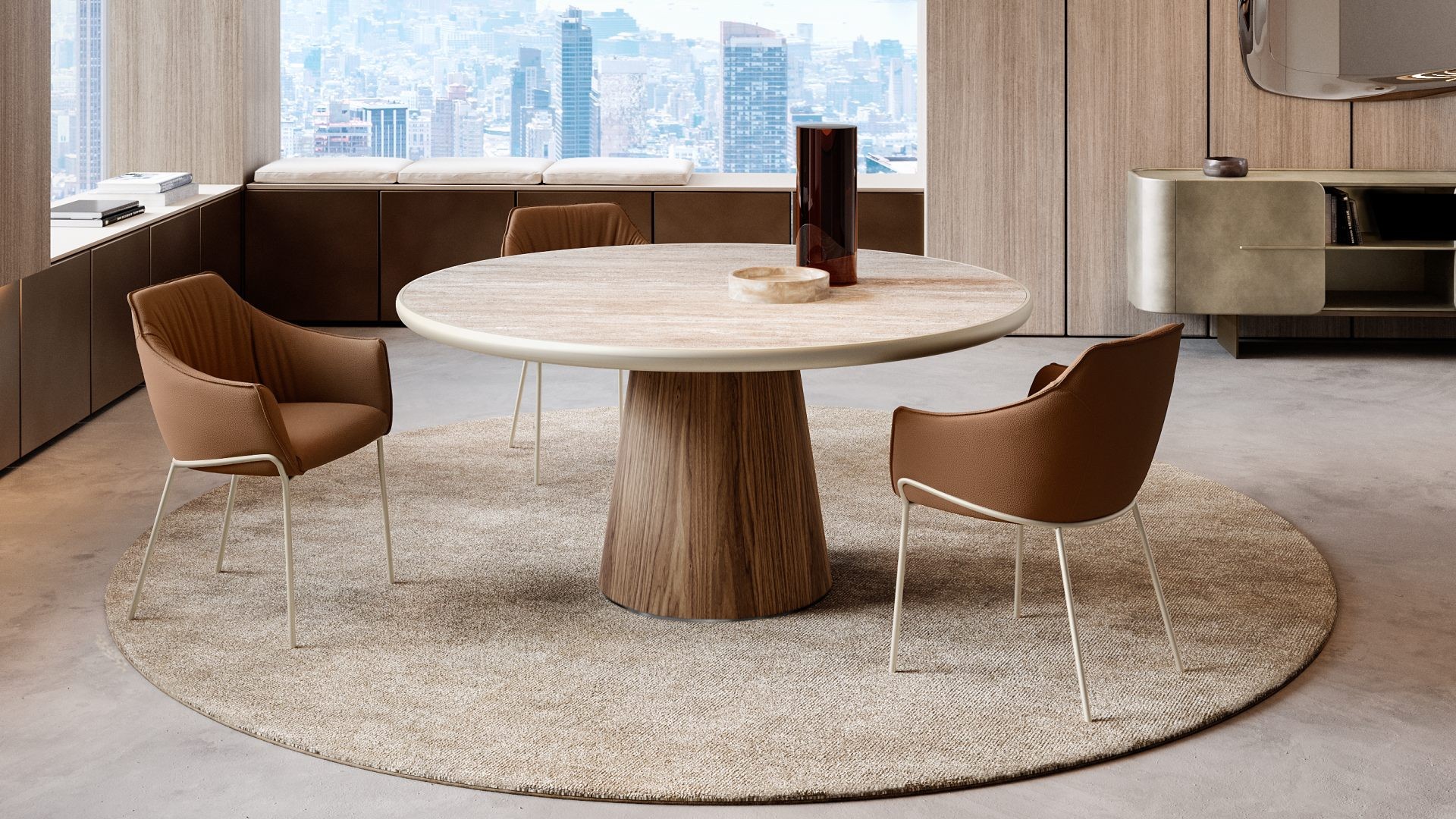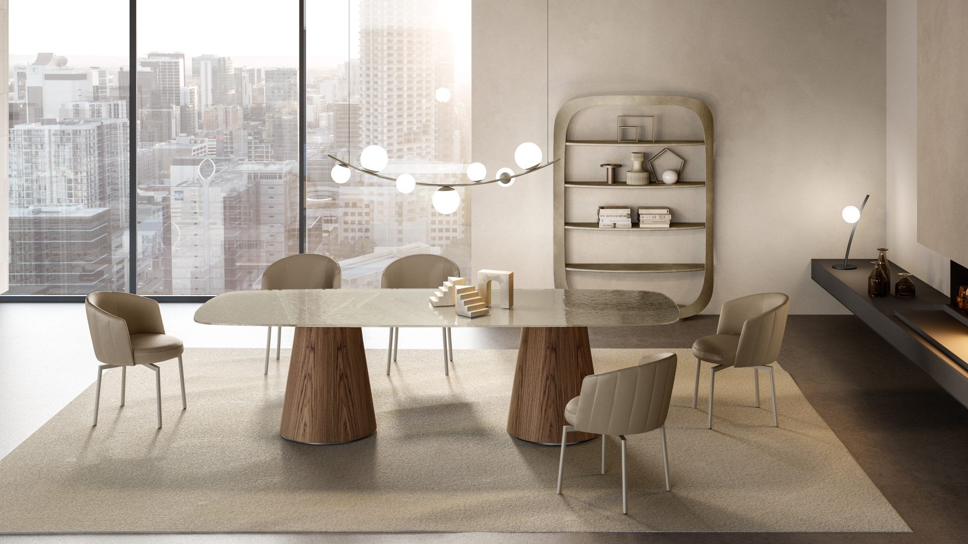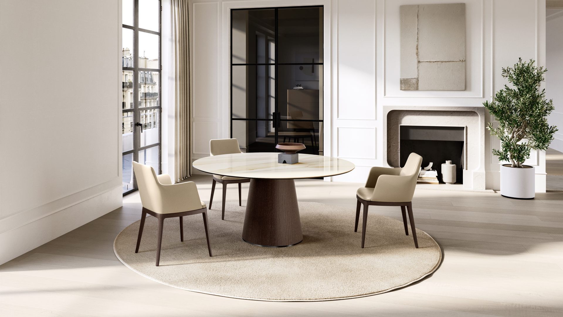 Čisté a skulpturální linie stolu Teo v kombinaci s materiálovými možnostmi rafinovaností detailů z něj činí ikonu současného designu. Tento vydařený kousek je výsledkem tvůrčího umu designéra Nella Palomba.