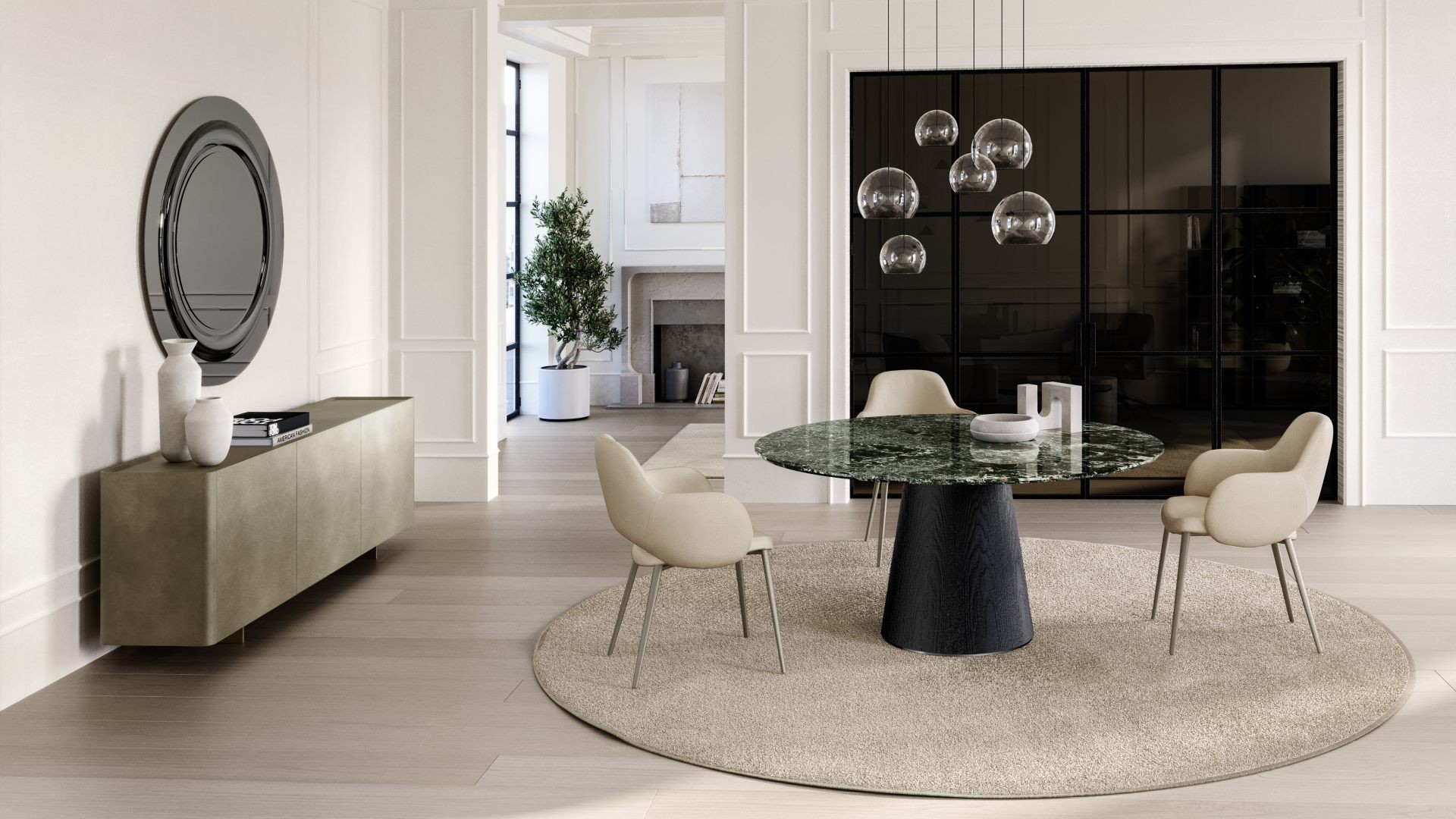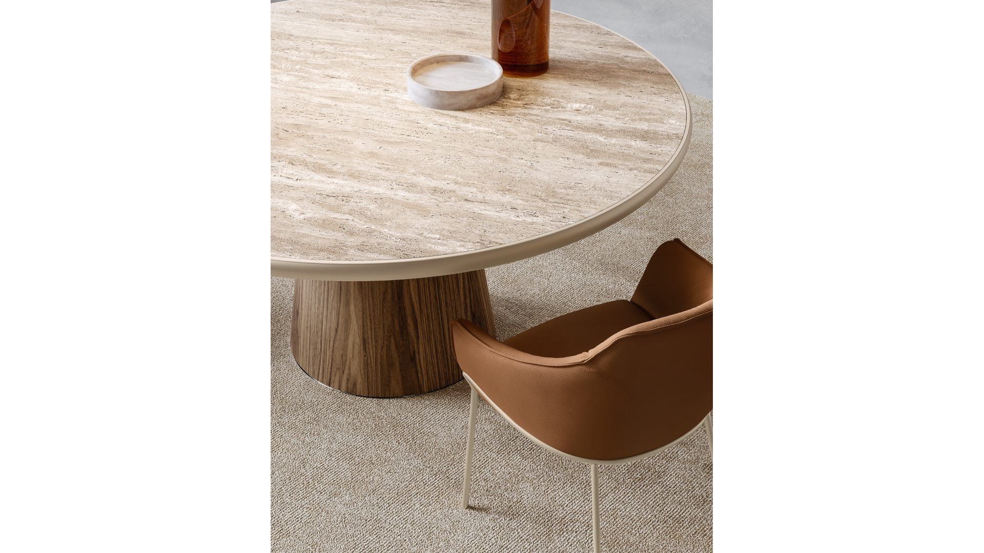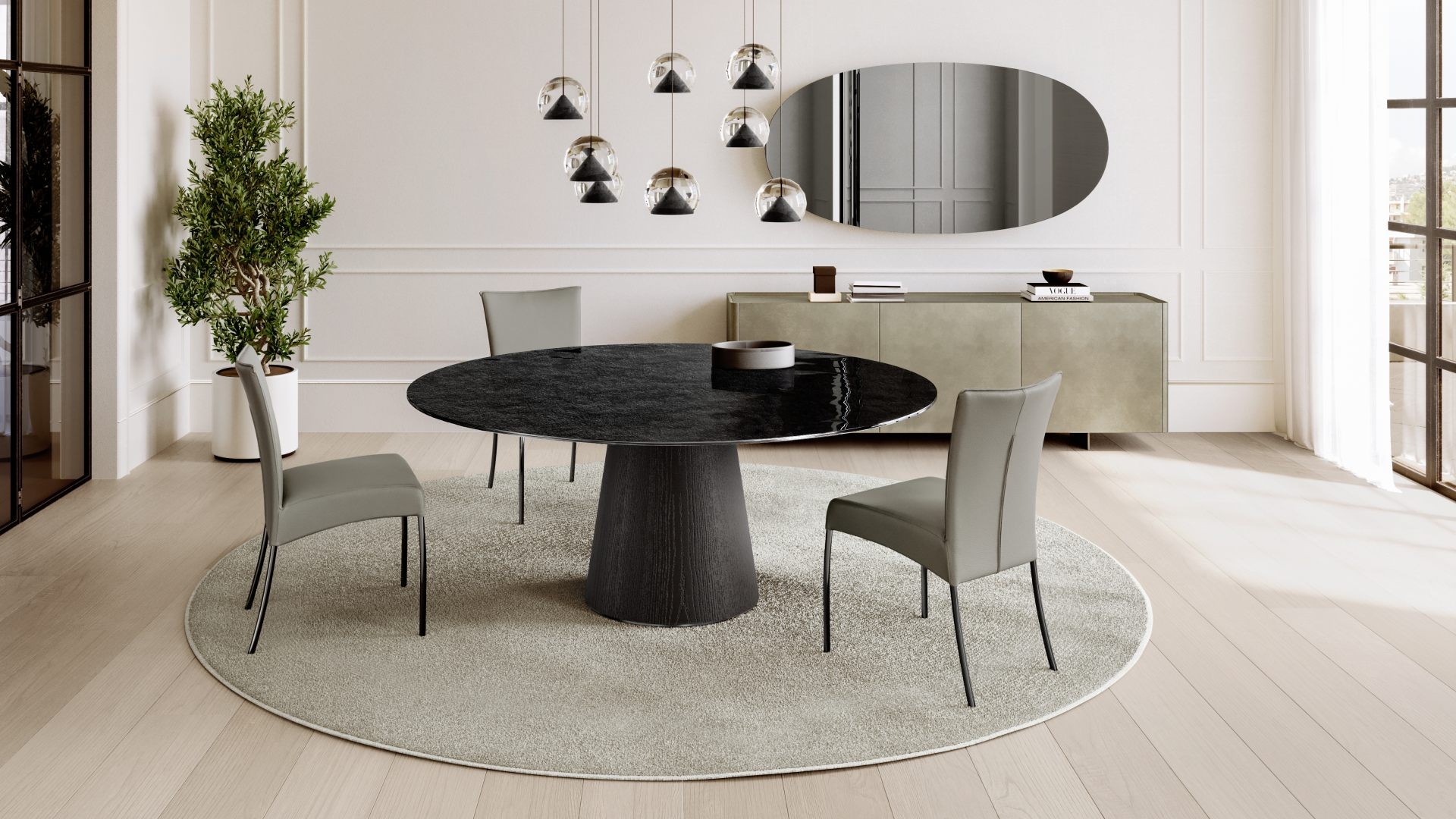 Čisté a skulpturální linie stolu Teo v kombinaci s materiálovými možnostmi rafinovaností detailů z něj činí ikonu současného designu. Tento vydařený kousek je výsledkem tvůrčího umu designéra Nella Palomba.