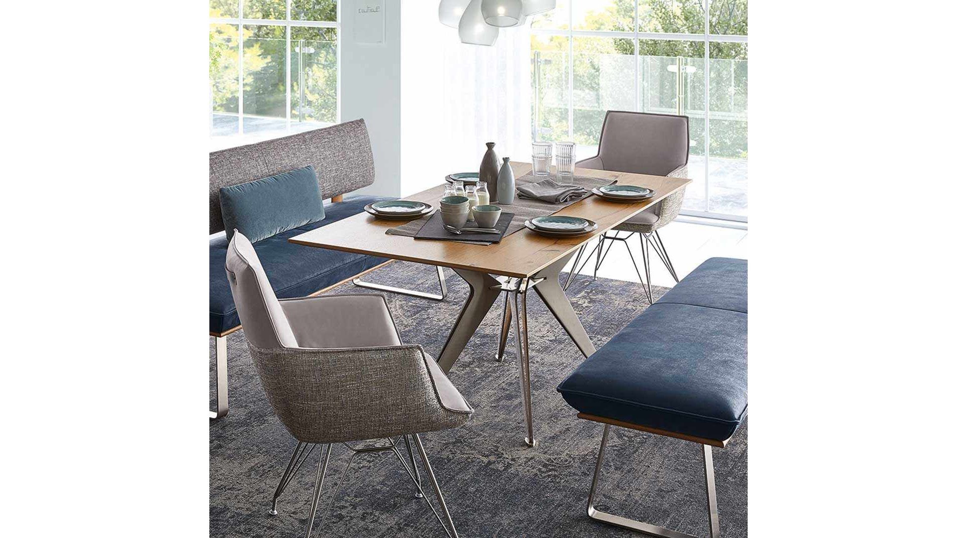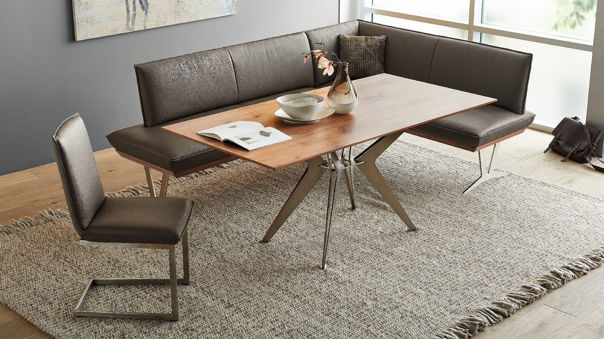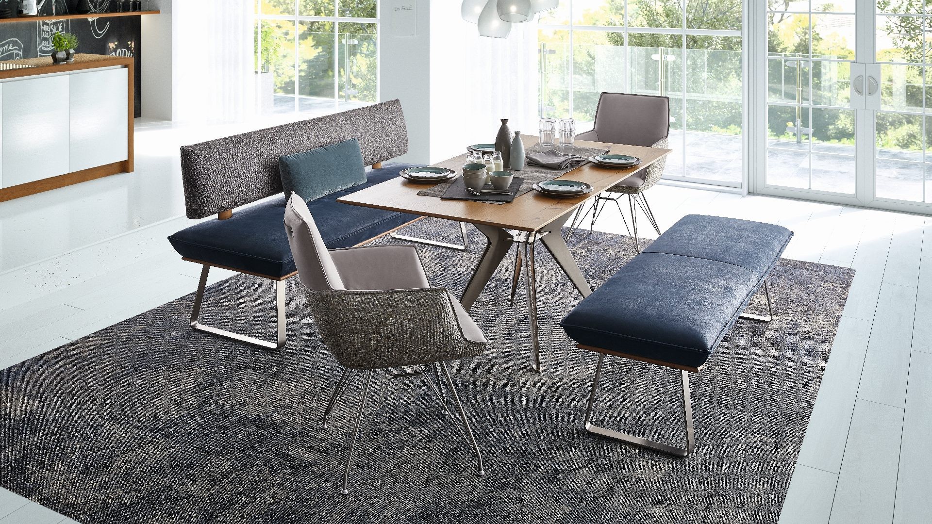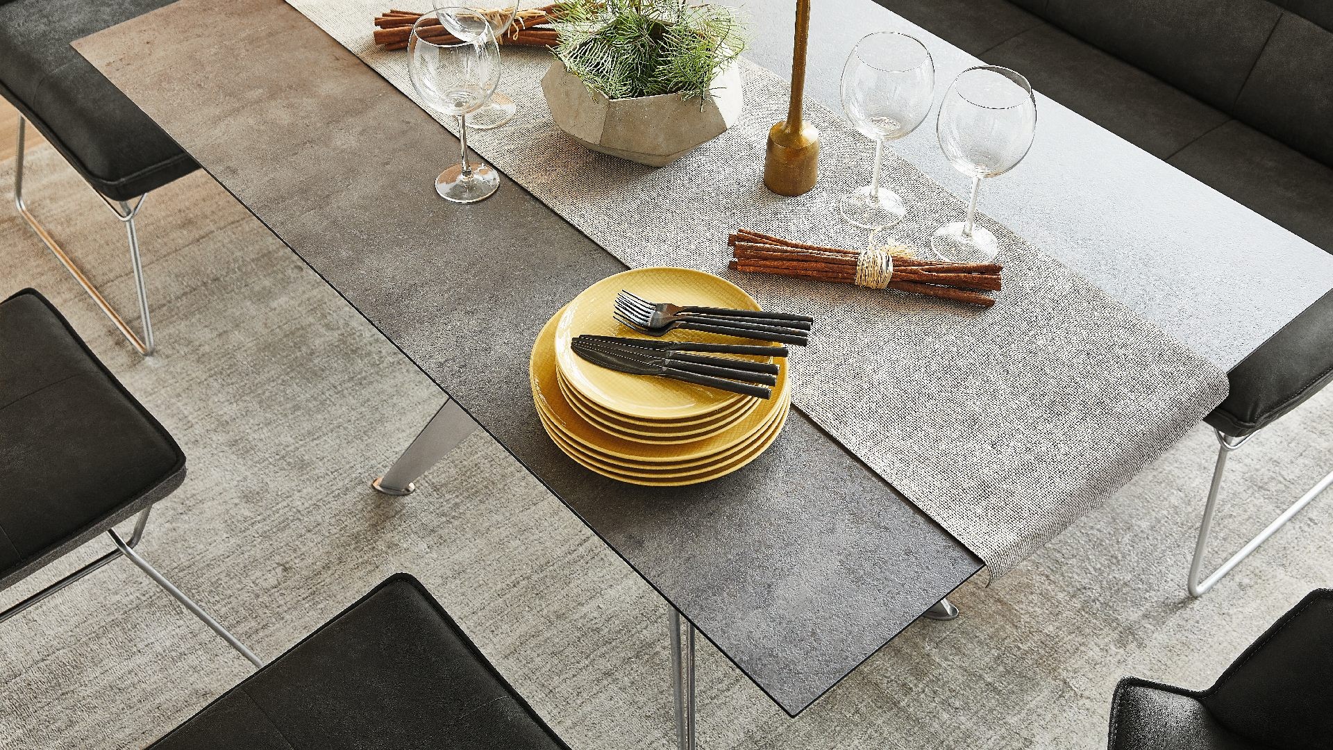 Stolová deska masivní dřevo, dýhy několika dekorů, keramika nebo HPL. Podnoží černý matný lak nebo vzhled nerezové oceli. Rozměr: 220 x 100 / 200 x 100 / 180 x 90 /160 x 90 / 140 x 90 (dřevo a keramika).