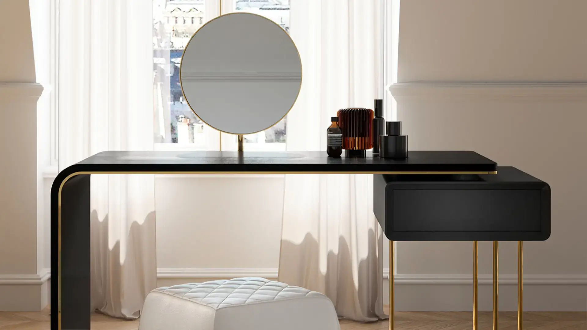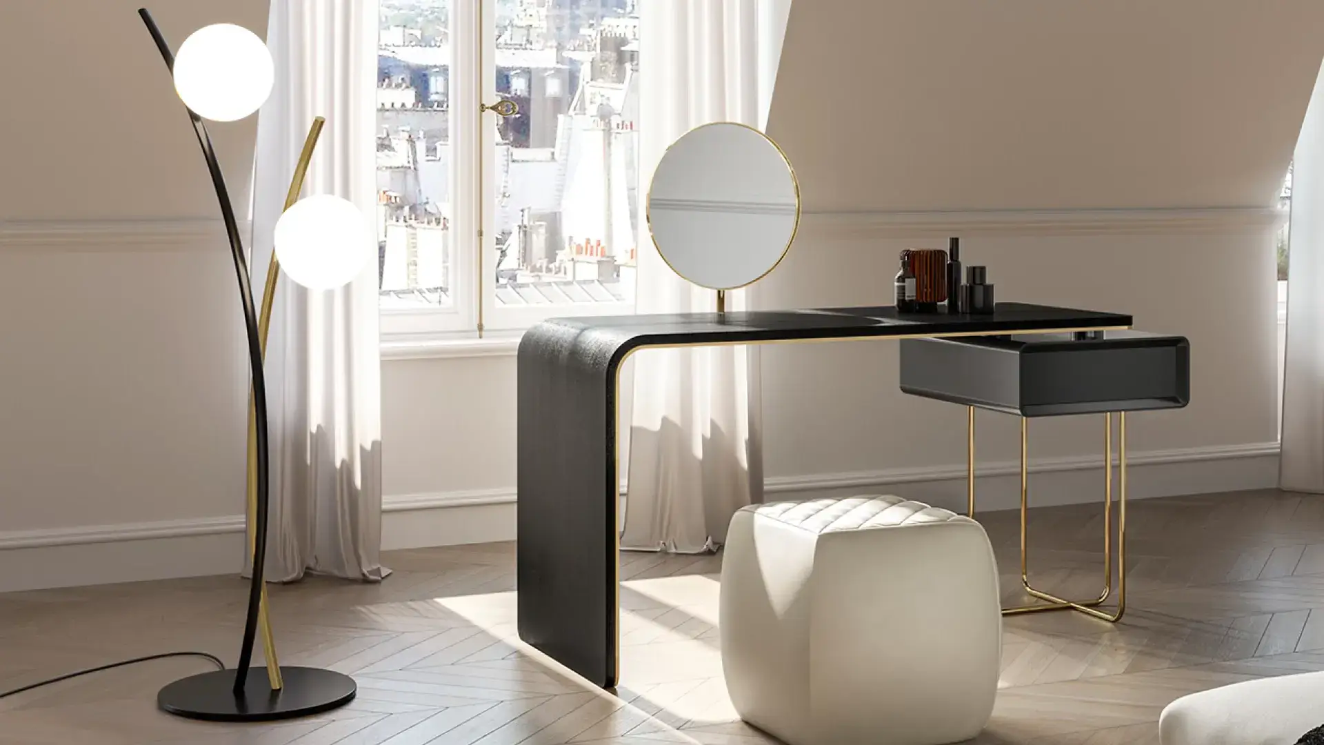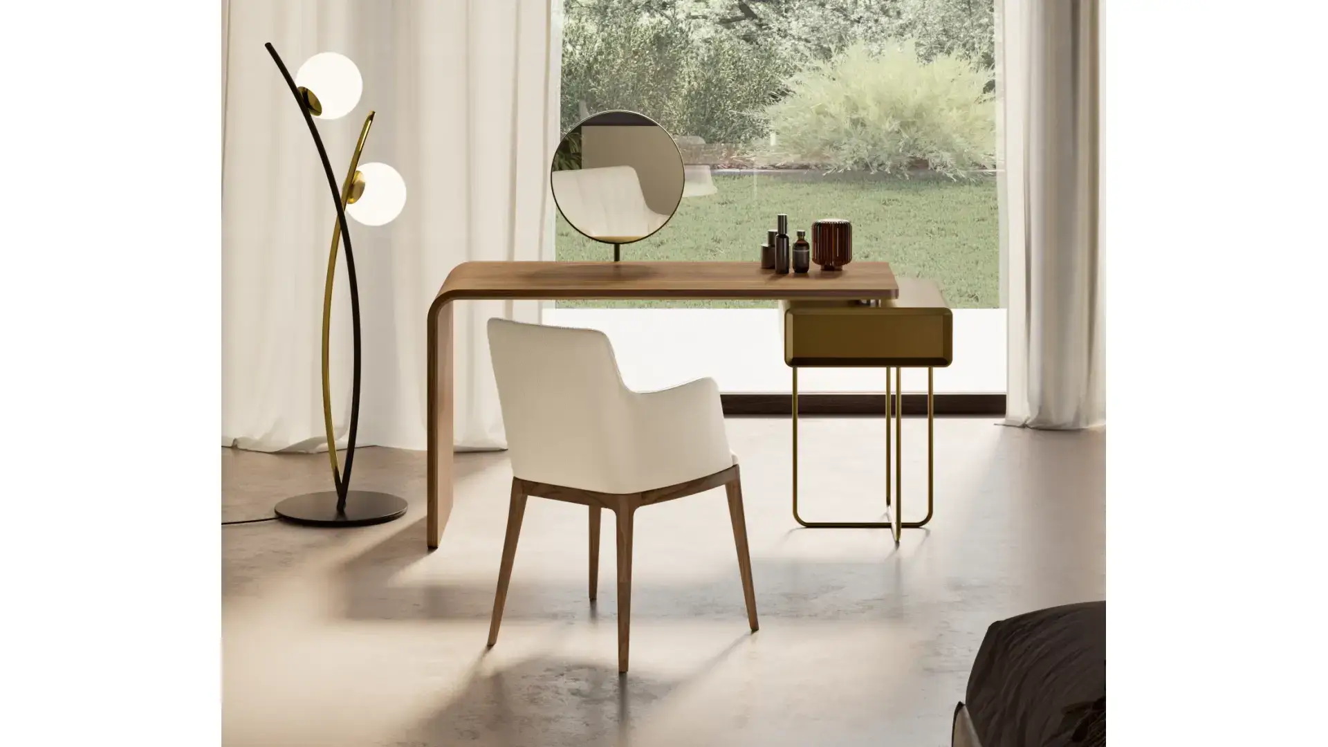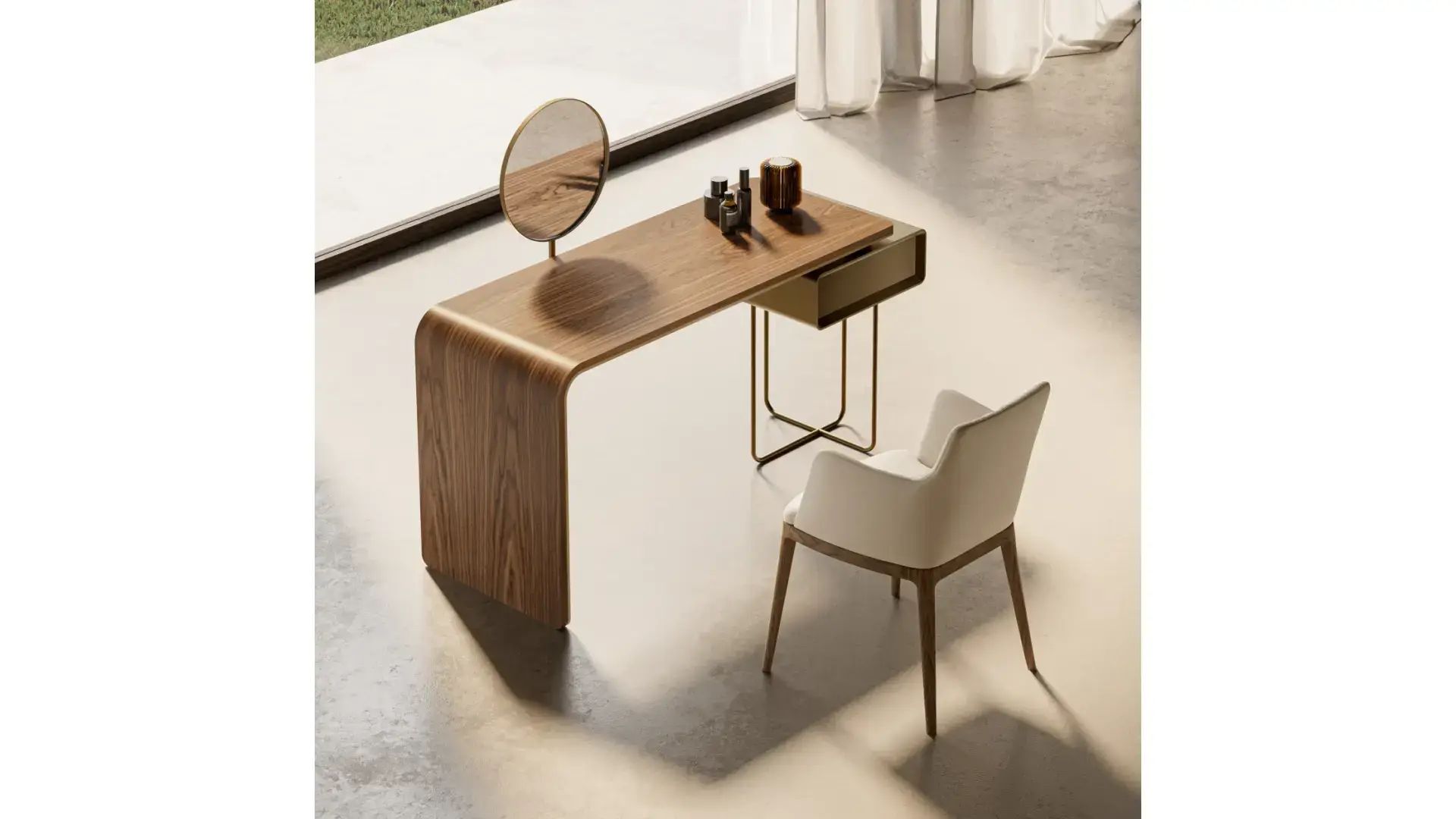 Auri je designový toaletní stolek do ložnice, ideální pro umístění na místo s dostatkem denního světla. Tento funkční kus nábytku v sobě nese jemný retro nádech, inspirovaný klasickými stolky, u kterých se ženy v minulosti česaly a líčily v soukromí své ložnice.Stolek Auri, tuto atmosféru minulosti přenáší do současnosti díky modernímu designu. Charakterizuje jej konstrukce a horní deska z dýhovaného dřeva s lakovaným profilem, zásuvka a podnoží z lakovaného kovu a extra čiré, fazetované zrcadlo o tloušťce 6 mm.