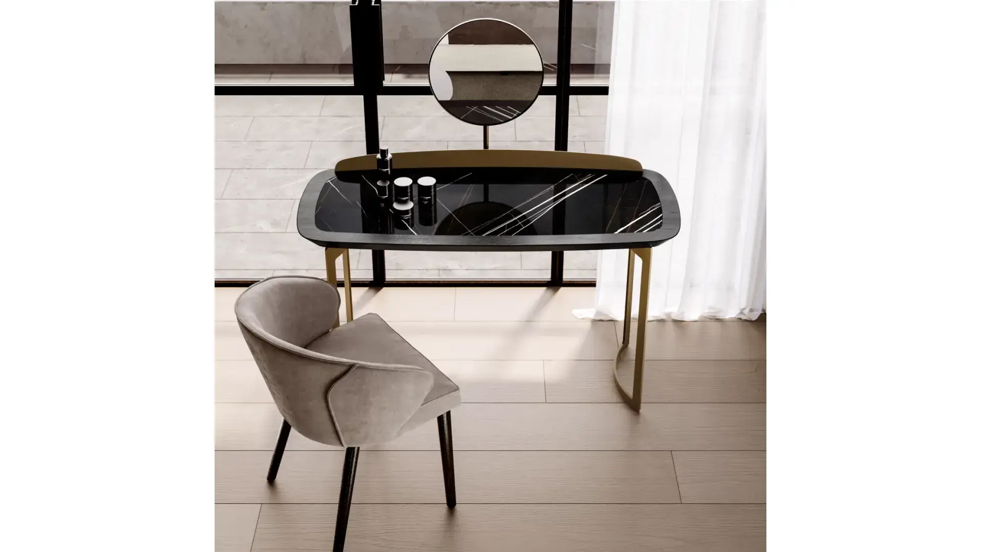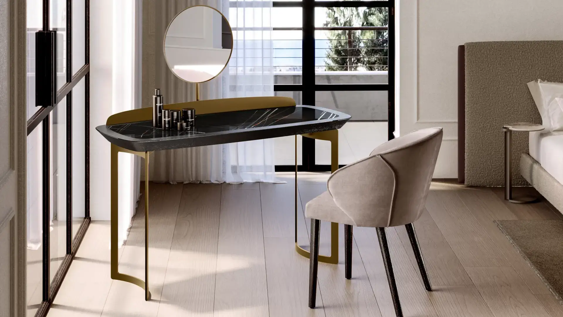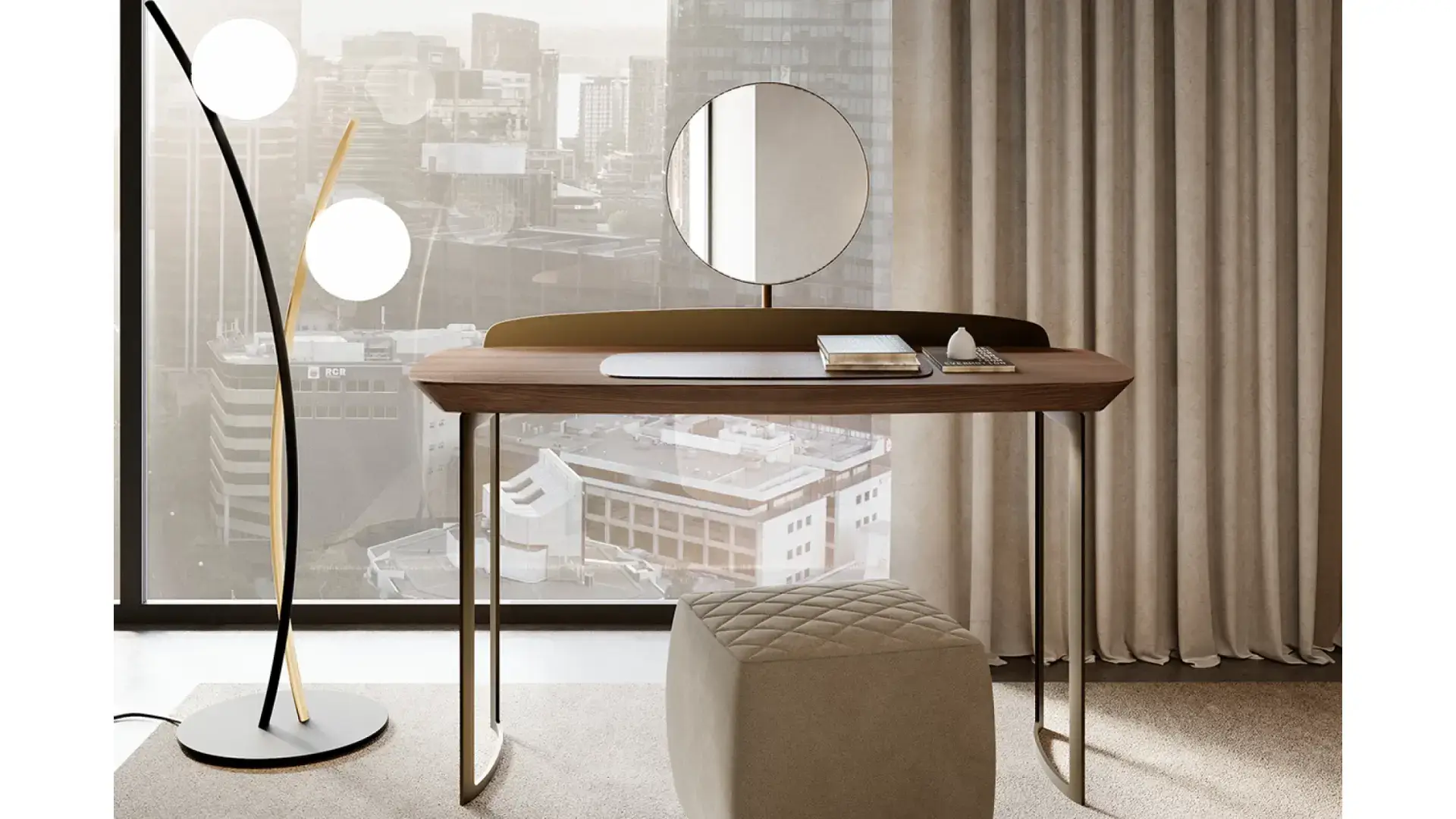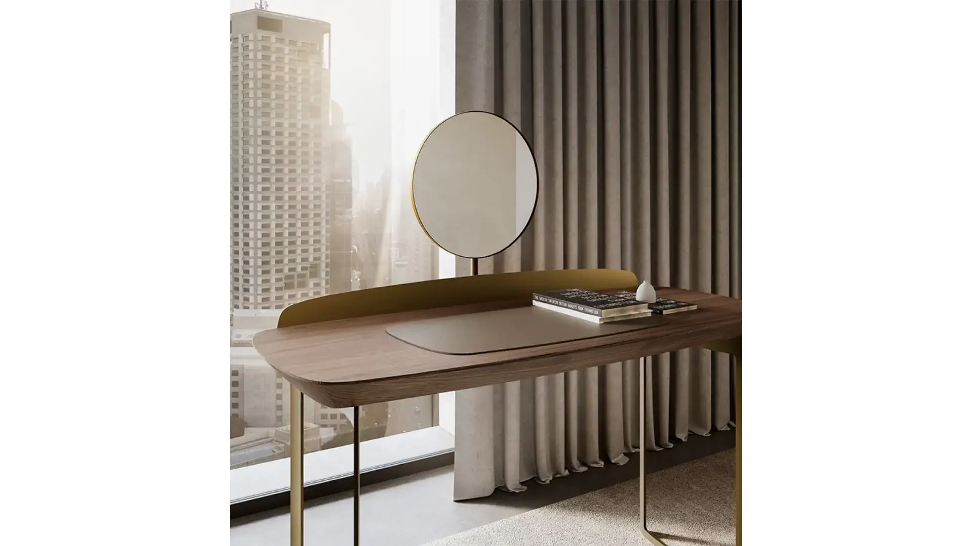 Icon je moderní toaletní stolek s jednoduchým a vytříbeným stylem – ideální řešení pro váš soukromý kout. Tento kus nábytku lze využít jak jako pracovní stůl, tak jako kout pro líčení. Stolek je vyroben s podnožím a rámem desky z lakovaného kovu, zatímco horní deska je z ořechového dřeva Canaletto. Velkým funkčním bonusem je extra čiré fazetované zrcadlo o tloušťce 6 mm. Nezáleží na tom, zda ho ozdobíte parfémy, svíčkami, šperky nebo kosmetikou – Icon dokáže zkrášlit každý prostor ložnice.