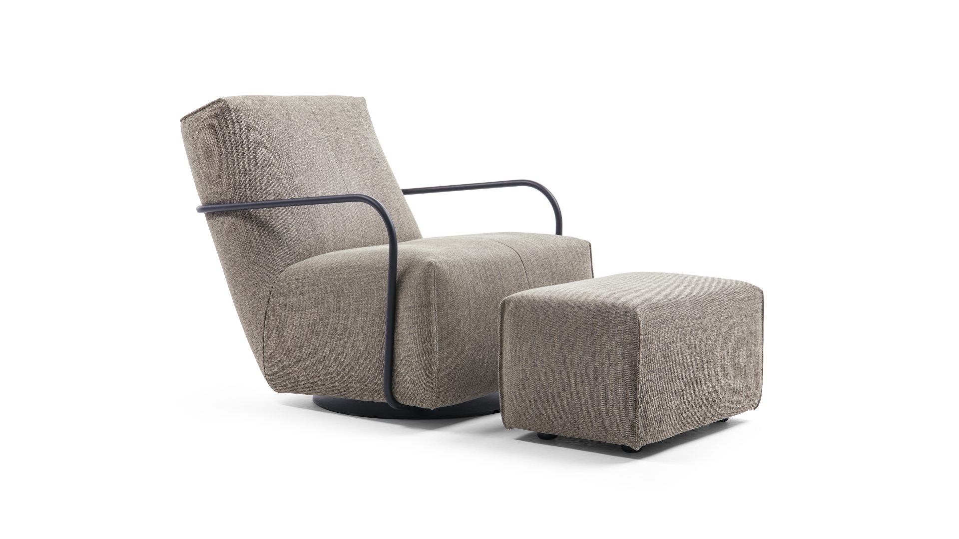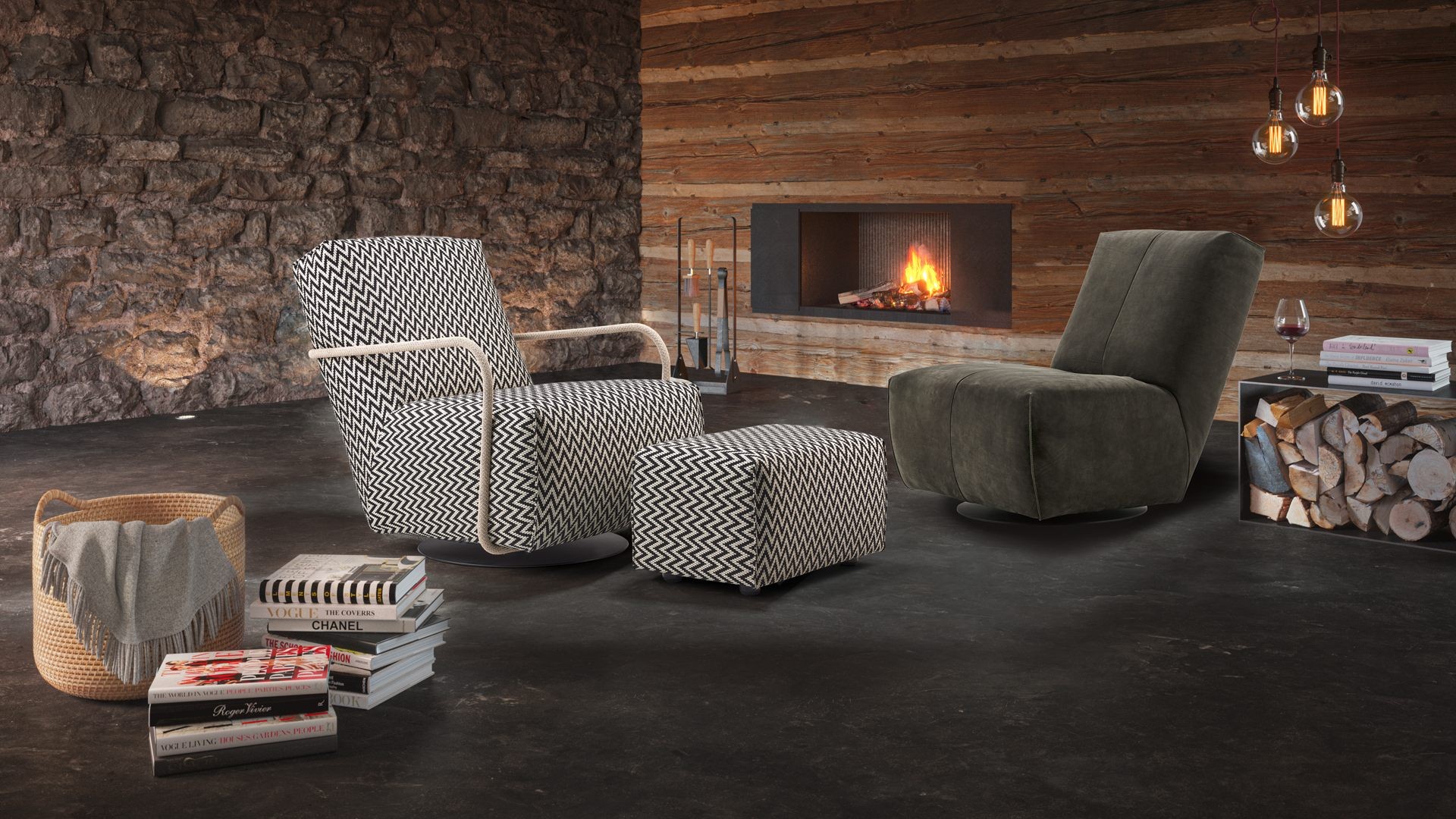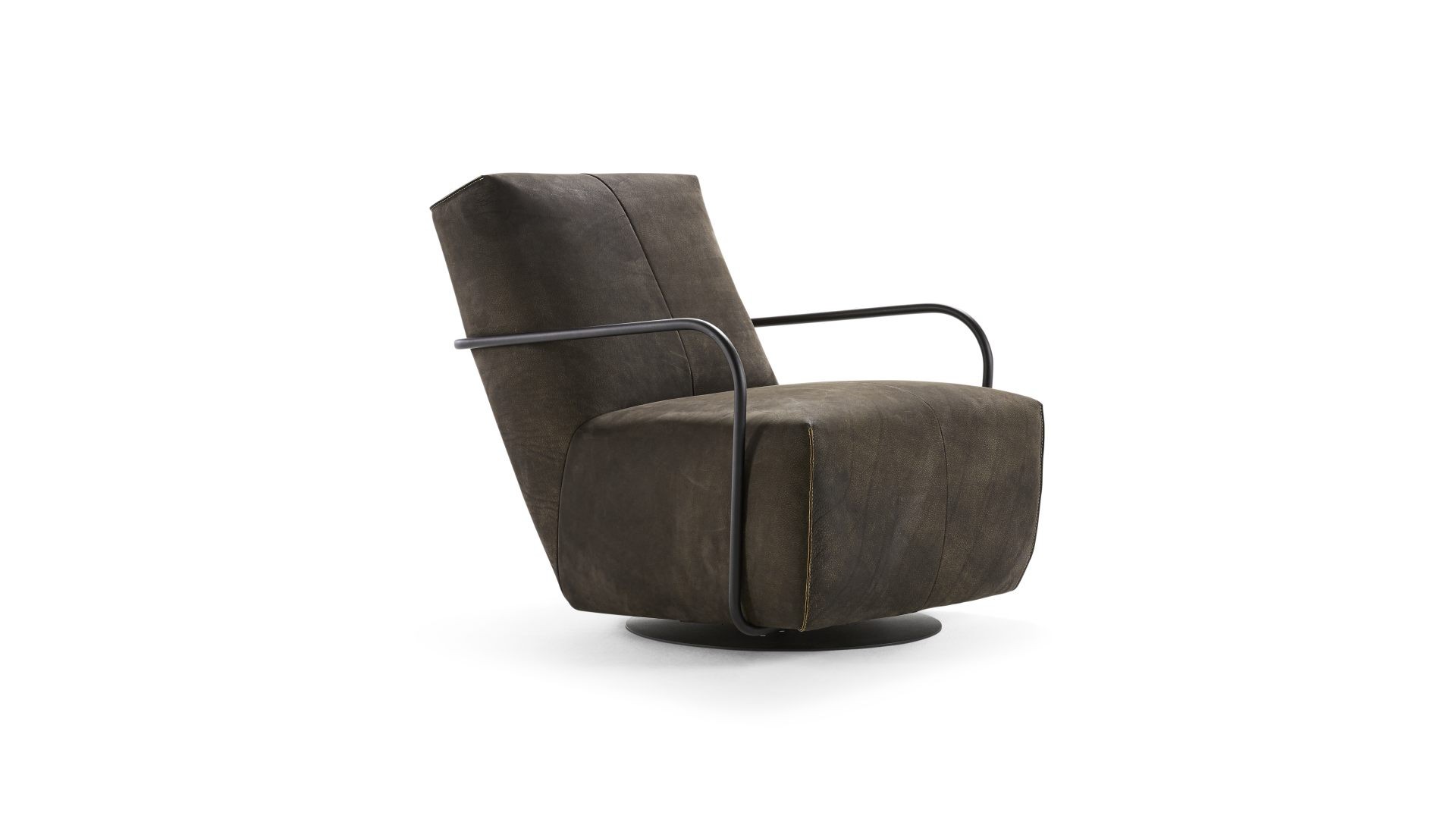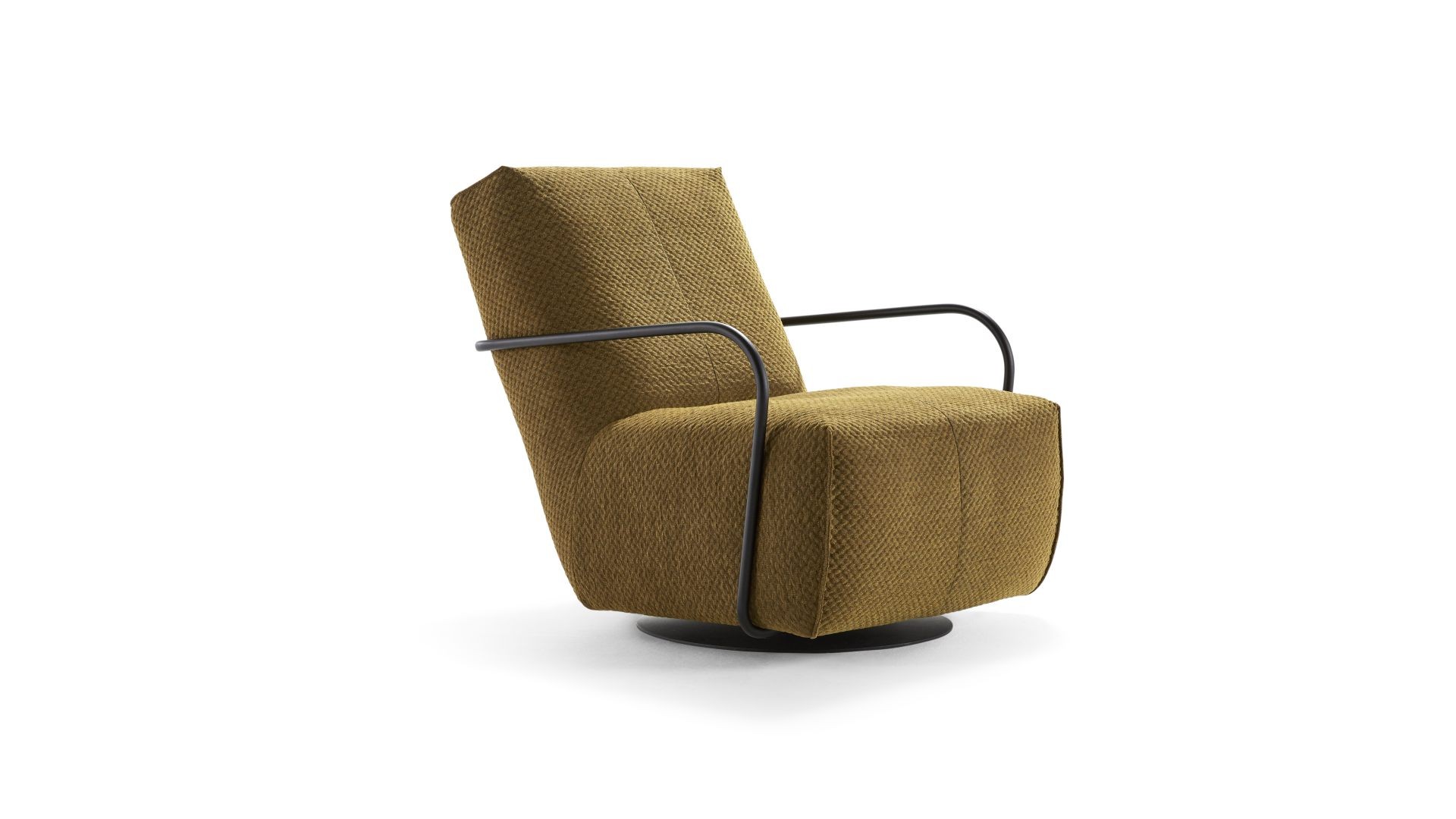 OTOČNÉ A HOUPACÍ KŘESLO S ELEGANTNÍM MIXEM MATERIÁLŮ. FUNKCE OTOČENÍ O 360°. LEHKÉ, JEMNÉ PODRUČKY, VOLITELNĚ VYROBENÉ ZE DŘEVA, KOVU NEBO OPLÉTANÉ. KOVOVÁ ZÁKLADNÍ DESKA JE V ČERNÉM MATU. DRUHY DŘEVA, POTAHY (LÁTKA/KŮŽE) A TYP ŠVU JE MOŽNÉ VOLIT.