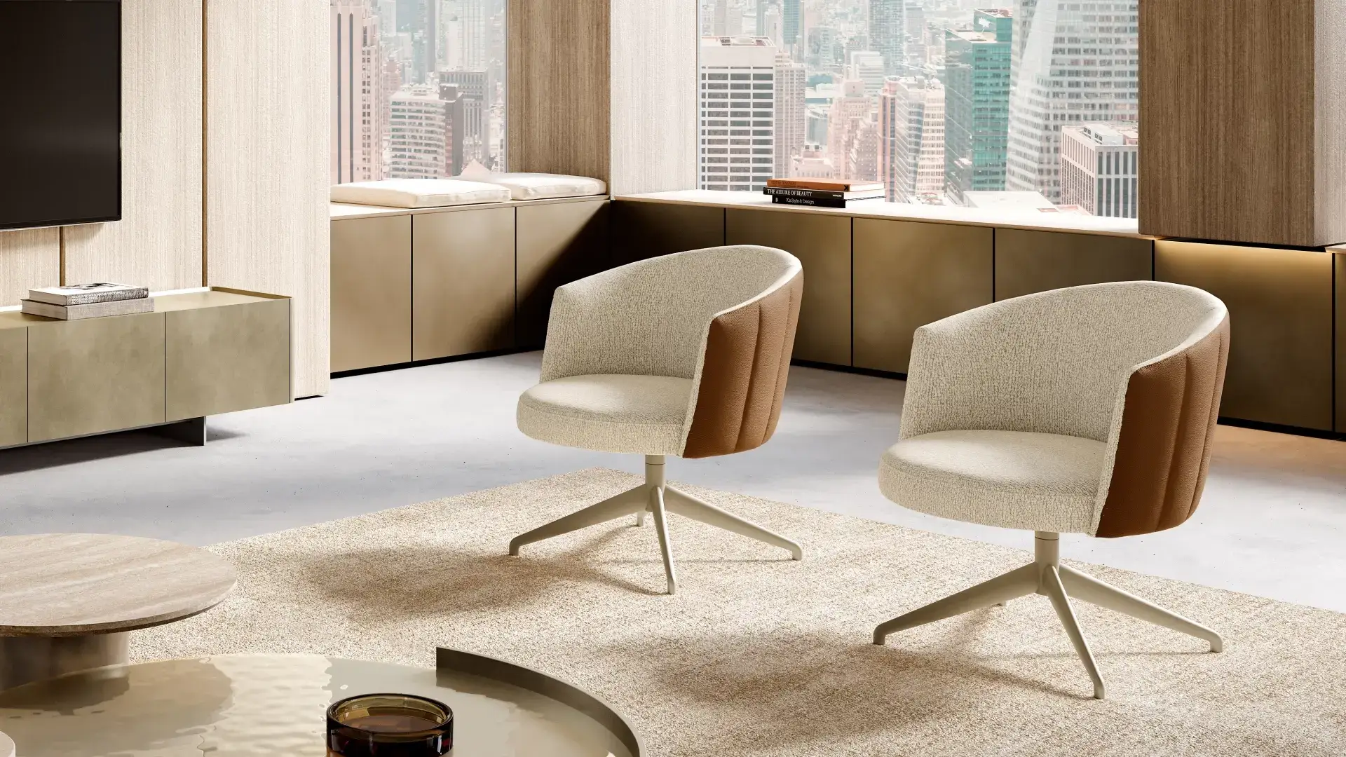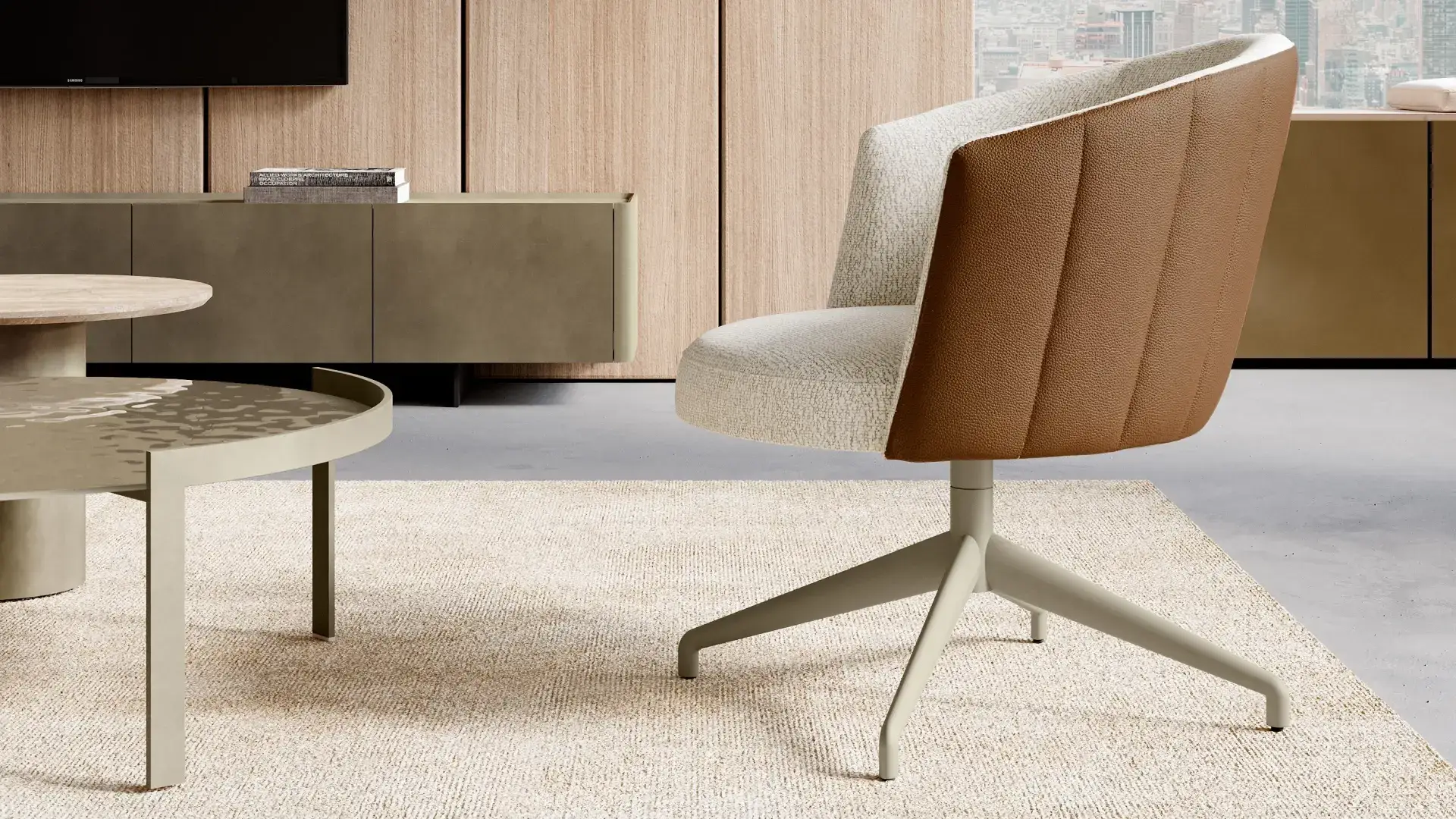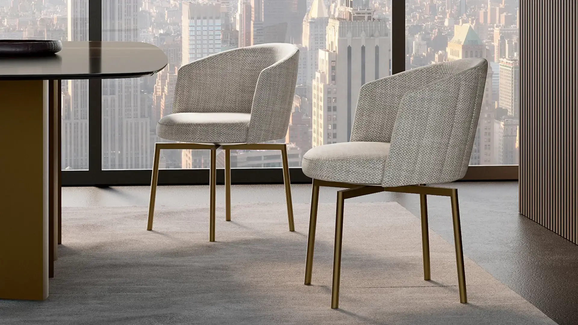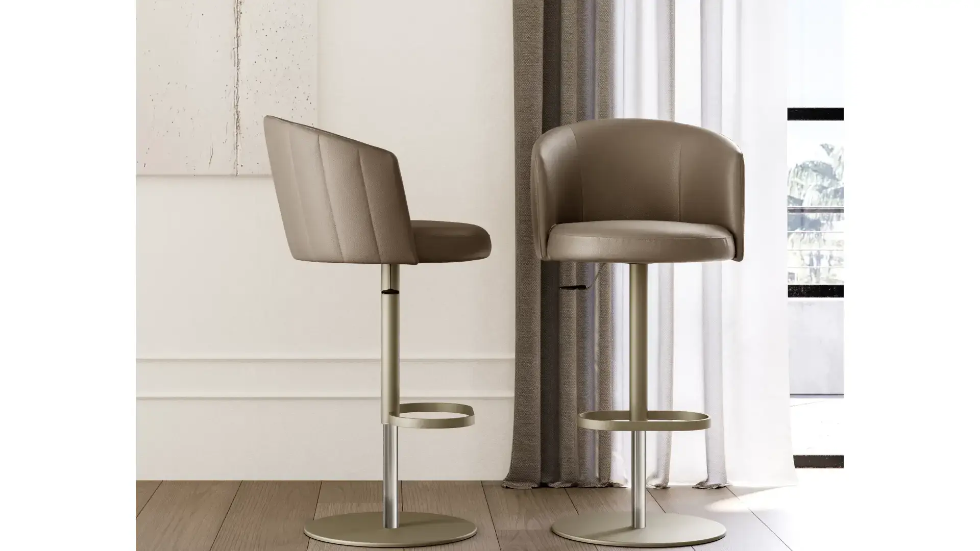 Vkusné a elegantní křeslo s pevnou nebo otočnou podnoží, které může mít lakované kovové nohy nebo centrální otočnou dřevěnou podnož. Robustní, obepínající opěradlo zdůrazňuje pečlivou pozornost k detailům, vysokou kvalitu krejčovského zpracování a řemeslnou preciznost. K dispozici je také barová židle s otočnou centrální podnoží a výškově nastavitelným sedákem nebo barová židle s pevnými kovovými nohami. Kolekci doplňuje lounge křeslo s centrální otočnou hliníkovou podnoží.