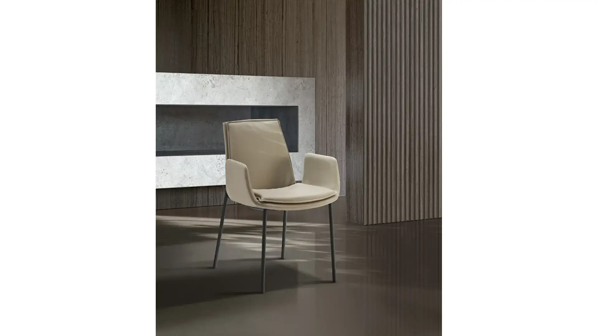 Židle a křeslo s obklopujícími liniemi, které nabízejí měkký polštář integrovaný do čalounění pro výjimečné pohodlí a příjemný pocit.